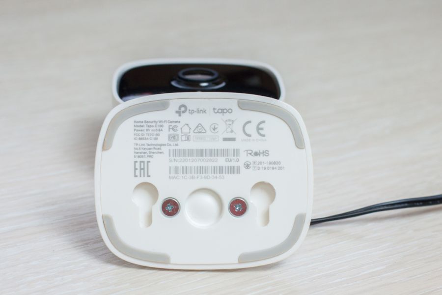 Дизайн и Корпус Tapo C100 упаковали в корпус из белого и черного пластика. Назовем его минималистичным, но если посмотреть на конкурентов, например, Xiaomi, то компании движутся в одном направлении по части дизайна. Размеры небольшие, материалы практичные, корпус неразборной, даже ножка не снимается. При этом не будет проблем с размещением камеры даже в скрытых уголках кабинета, холла или кладовой. Под ножной – два отверстия для крепления на стену и четыре резинки для устойчивого расположения на столе. Два пластиковых дюбеля и саморезы идет в комплекте. Вместе с ними в коробке пара инструкций по установке и монтажу.