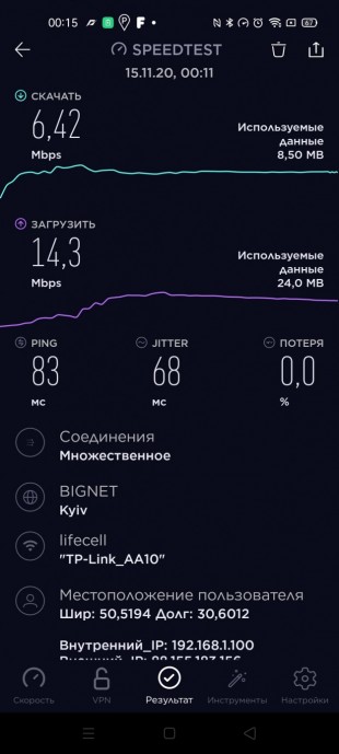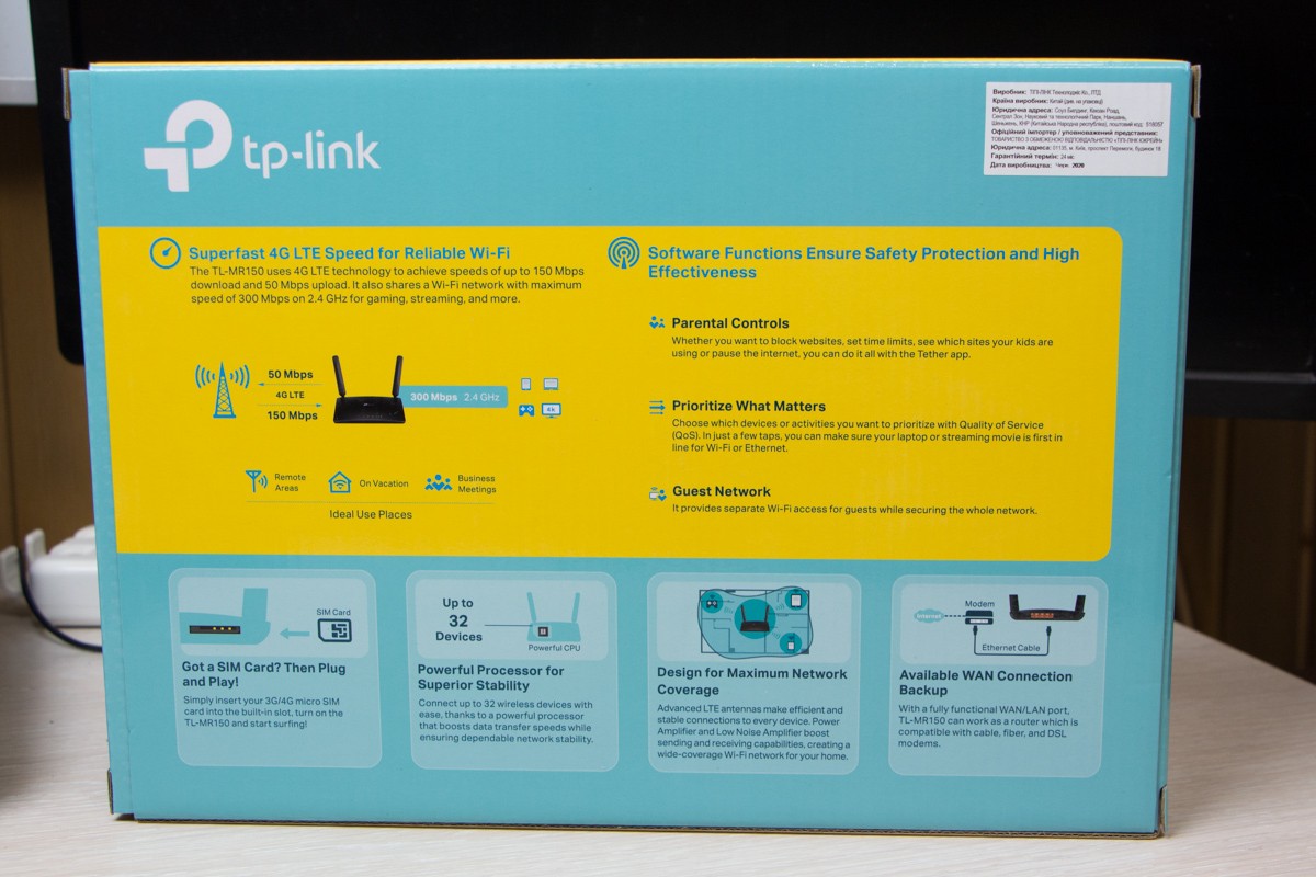 Сборка без замечаний. Возможности Обозреваемый TL-MR150 - не просто Wi-Fi роутер. Это также 4G LTE маршрутизатор, что означает, что в него можно вставить любую сим-карту 4G или 3G (от lifecell, Киевстар или Vodafone, или мобильной сети операторов других стран). Ограничений нет, лишь бы стандарт подходил. Согласно информации от TP-Link, роутер поддерживает сети FDD-LTE Cat4 (800/900/1800/2100/2600 МГц), TDD-LTE (1900/2300/2500/2600 МГц), а также 3G: DC-HSPA+/HSPA+/HSPA/UMTS (900/2100 МГц). В маршрутизаторе только 1 слот для Micro SIM-карты, поэтому вы можете использовать в виде источника только сеть одного оператора. Обозреваемый маршрутизатор TP-Link укомплектовали двумя внутренними антеннами Wi-Fi и двумя съемными 4G LTE антеннами, которые можно снять и заменить, например, на более мощные с дополнительным питанием. Это его главное отличие от модели TP-Link TL-MR6400 с двумя внешними Wi-Fi антеннами и внутренними 4G. Устройство поддерживает стандарт 802.11 b/g/n в диапазоне 2,4 ГГц с максимальной скоростью передачи данных 300 Мбит/с. Этого достаточно, так как в итоге все равно все упирается в возможности оператора сотовой связи. А если вы используете Wi-Fi для таких вещей, как обмен файлами и потоковая передача мультимедиа, только тогда поддержка стандарта ac имела бы значение. Ко всему прочему входящий WAN порт ограничен 100 Мбит/с. Он может выполнять функцию LAN порта, ели 3 других LAN уже заняты. В качестве альтернативы, если у вас есть второй Wi-Fi маршрутизатор, можете подключить его к одному из портов, чтобы обеспечить подключение дополнительных устройств. Замер скорости Максимальная скорость скачивания составила 6.42 Мбит/с, а закачки – 14.3 Мбит/с. Смартфон realme 7 Pro в этом же месте показал скорость ровно в 2 раза ниже. Это существенное понижение. Выигрыш во внешних антеннах модели TL-MR150 очевиден. Функции Маршрутизатор TP-Link умеет не только передавать данные, но и контролировать их. Некоторые функции из списка ниже пригодятся даже неопытным пользователям.