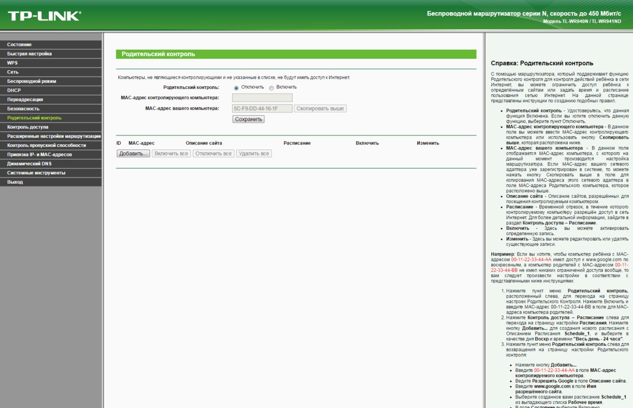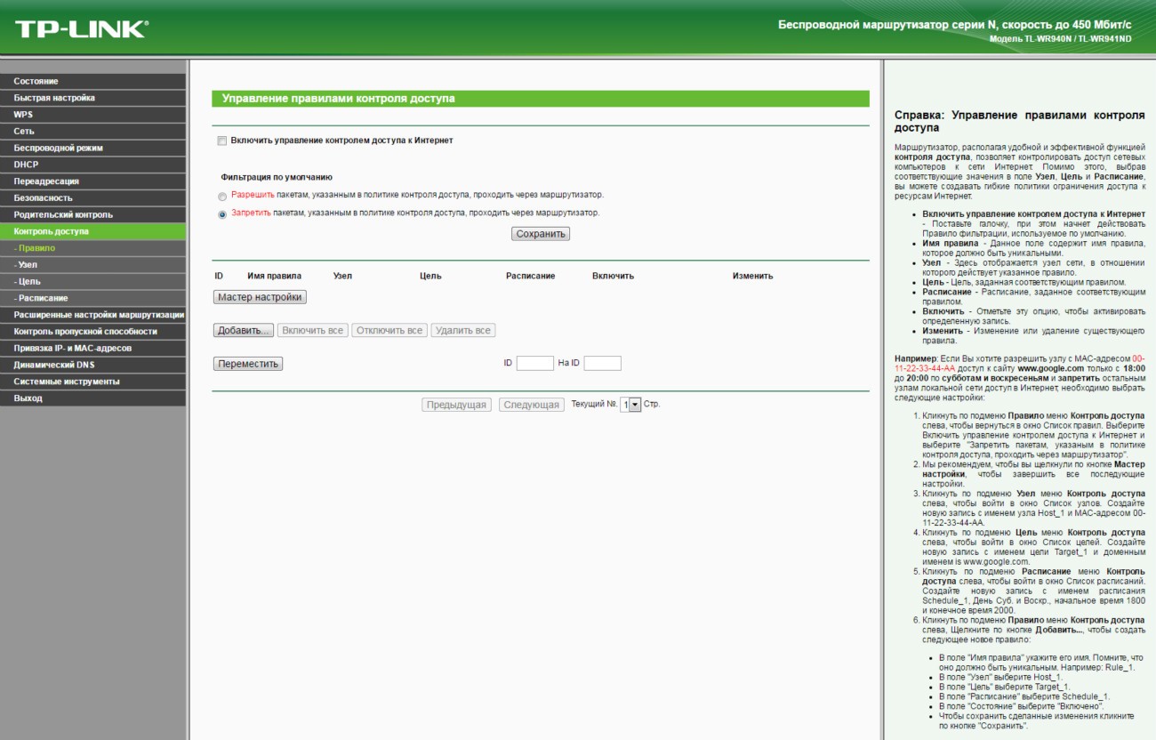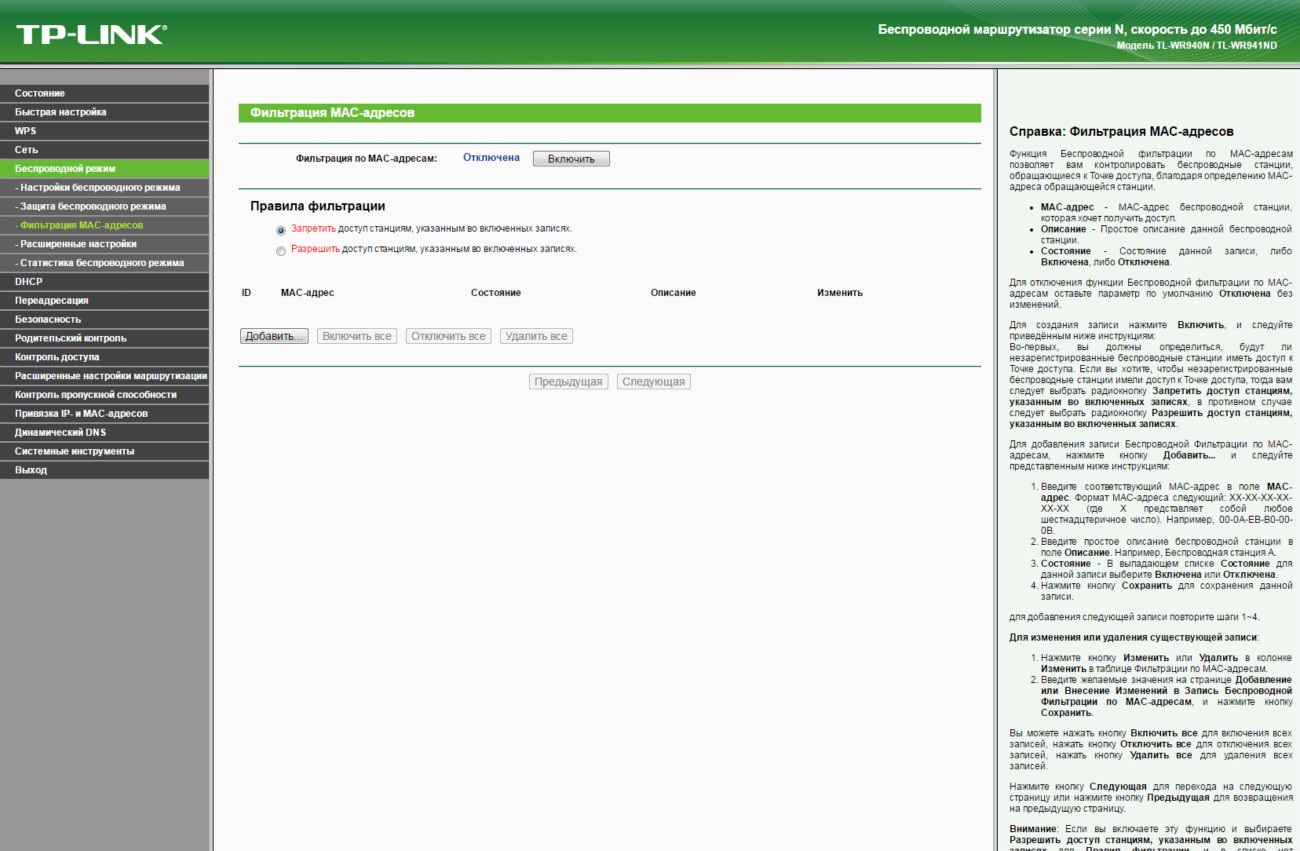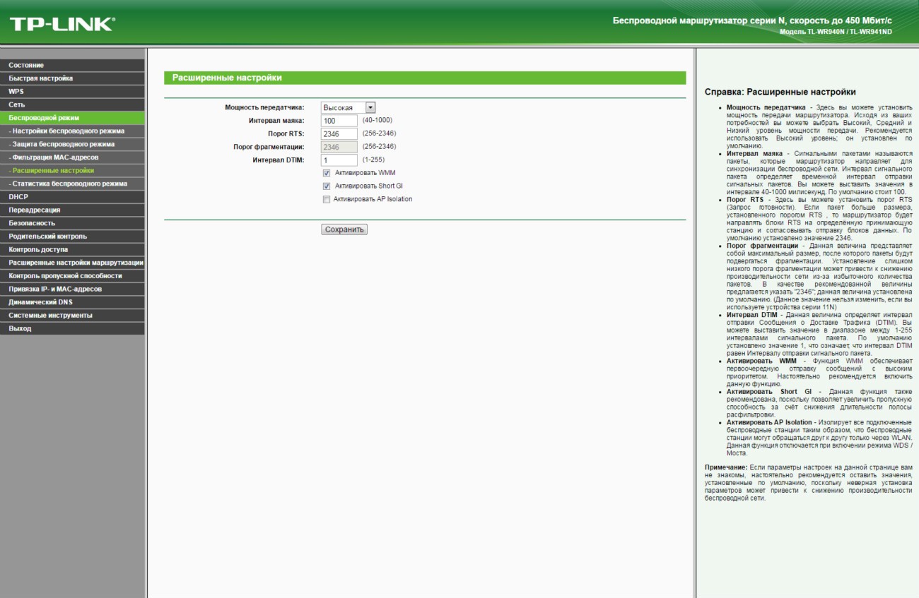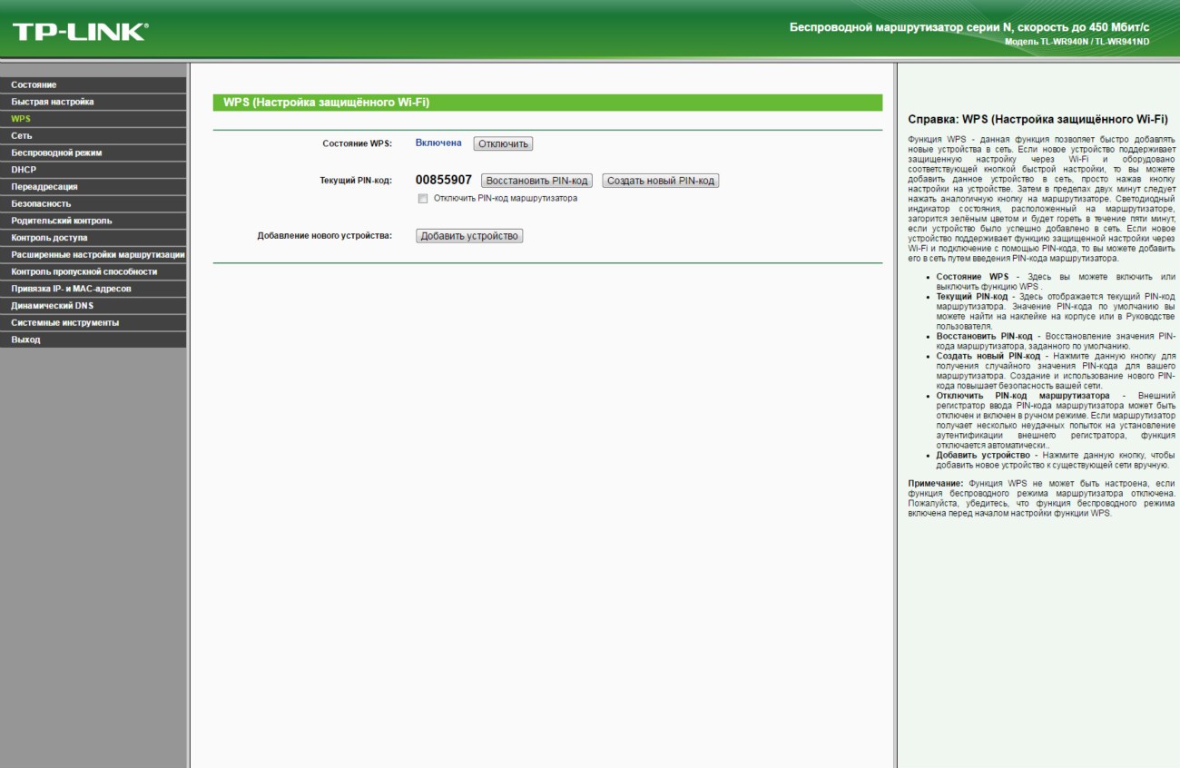 Обзор TP-Link TL-WR940N - беспроводная передача данных на скорости до 450 Мбит/сДаже на устаревшем оборудовании, которое поддерживает только стандарт Wi-Fi 802.11 b/g/n, можно добиться скорости беспроводной передачи данных между устройствами в 450 Мбит/с. И поможет реализовать данный сценарий маршрутизатор TP-Link TL-WR940N. Больше информации об этом роутере с ценником в 799 грн далее в обзоре. На тест к нам попало устройство в версии TL-WR940N Ver. 3.0. Аналог по названию, но не по начинке также продается, но эта модель лишена приставки Ver. 3.0, выглядит по-другому и фактически утратила свою актуальность. Ей на смену пришла достойная замена с увеличенной до 450 Мбит/с скоростью передачи данных в беспроводной сети. В комплекте поставки TL-WR940N производитель предусмотрел все необходимое для быстрого начала работы. Здесь есть Ethernet кабель, адаптер питания, руководство по быстрой настройке и диск с мастером установки и драйверами. Так что проблем с настройкой маршрутизатора даже у неподготовленного пользователя не будет. Но об особенностях интерфейса позже. Обсудим корпус. Дизайн основан на комбинации черного пластика в матовом и глянцевом исполнении. Вся верхняя крышка усеяна ромбовидной текстурой выпуклой формы. Отдельных элементов в сборке не много, так что можно назвать ее отменной. Упрекнуть производителя действительно не в чем. На верхней крышке со стильным узором ярко блестит полированный логотип бренда. Сюда же для удобства пользователя вынесены 8 индикаторов. По их подсвечивающимся синим пиктограммам без объяснения понятно, что и как происходит в работе в данный момент. Данные передаются и принимаются тремя всенаправленными антеннами. Программно используется технология 3х3 MIMO, которой производитель добивается не только стабильности, но и высокой скорости - до 450 Мбис/с. Эта цифра для маршрутизатора с поддержкой технологии Wi-Fi стандарта 802.11 b/g/n значительная, так что даже в том случае, если инфраструктура не позволяет быстро перейти на стандарт 802.11 ac, а данные критичны и важны, то для одновременной работы с несколькими подключенными клиентами аналог TP-Link TL-WR940N будет найти сложно. Подключиться к маршрутизатору можно классическим методом - через полученный или указанный вами в настройках пароль. Ну или более просто - нажав кнопку WPS на тыльной стороне устройства и виртуальную или физическую на подключаемом. Все порты TP-Link TL-WR940N поддерживают подключение на скорости 10/100 Мбит/с. В пару к одному WAN порту идет 4 LAN порта. Эта модель ограничивает покупателя внешним источником в 100 Мбит/с, однако в данном ценовом сегменте это допустимо. Кроме того, производитель сообщает о наличии технологии WDS, а значит возможности расширения беспроводной сети за счет подключения новых передающих или ретранслирующих устройств. То есть данный маршрутизатор может стать одним из 2-х, 3-х или 10 роутеров, которые обеспечивают стабильный проводной/беспроводной интернет и локальную связь в пределах нужной вам территории. Для справки, доступна возможность настройки трафика для каждого потребителя посредством IP QoS. Программно поддерживается: динамический IP адрес (DHCP), работа со статическим IP адресом, PPPoE, PPTP/L2TP. Выбор шифрования данных стандартный: WEP, WPA/WPA2, WPA-PSK/WPA2-PSK. Пользователь сам может ограничивать MAC адреса, внося их в черный список. Ниже в галерее собраны основные скриншоты интерфейса разд