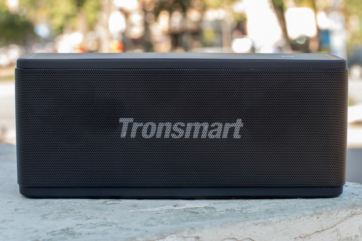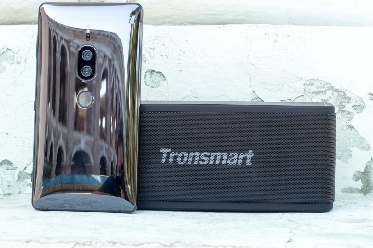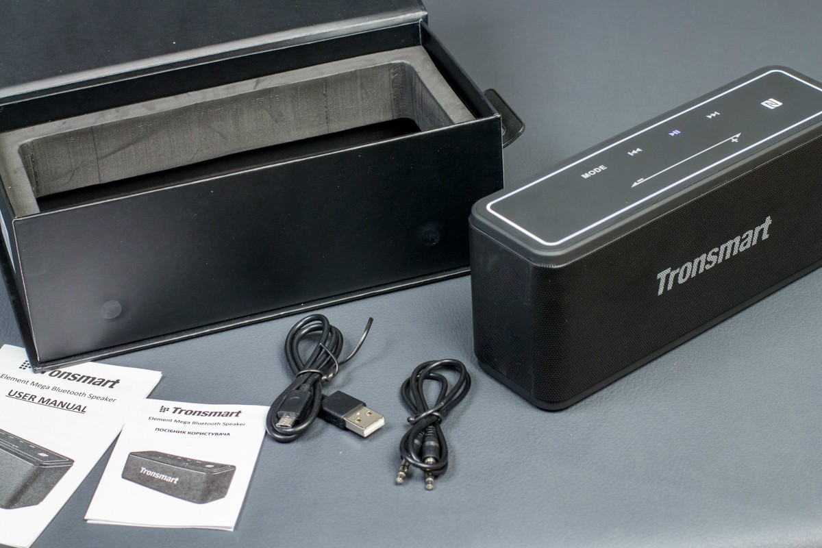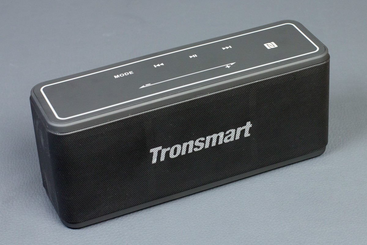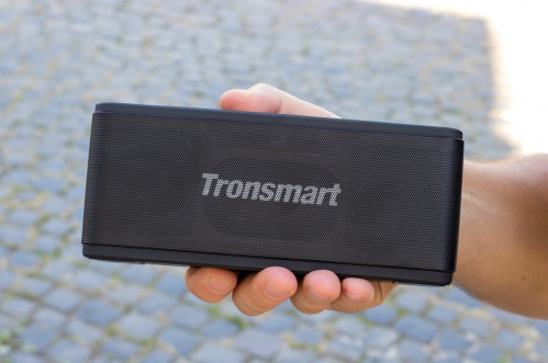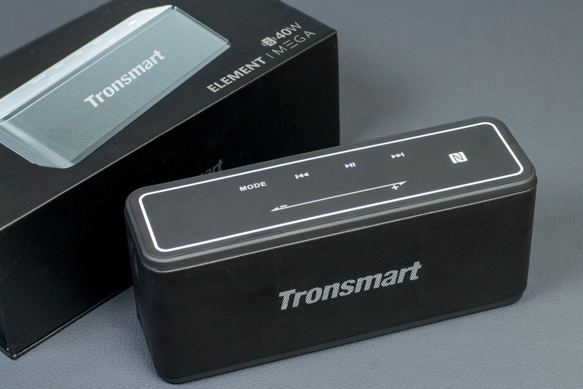 Обзор Tronsmart element Mega: басистая колонка с красивой, но сдержанной внешностью и ярким управлениемTronsmart element Mega – колонка, которая способна конкурировать с продуктами более известных брендов. Она доказала, что басов, чистоты звучания и максимальной громкости в ней достаточно для требовательного покупателя и ценника, который выставил на устройство производитель. Наши впечатления и подробности по части характеристик узнаете из обзора. Дизайн и корпус Модель element Mega выглядит скромно, но при этом ощущается, что материалы подобраны грамотно. Сетка – металлическая, остальное – прочный и софт-тач пластик черного цвета. Корпус защищен от падений и ударов, хотя внешность этого никак не выдает. А вот защиты от попадания влаги нет. Габариты колонки – 193 x 57 x 82 мм, вес – 662,3 г. Ручки на корпусе не предусмотрено, так что носить в руке гаджет не очень удобно. Плоские ножки из резины не дают колонке скользить по поверхности стола или другой плоскости. По форме мы получаем скругленный прямоугольник из металла и пластика. К подборке материалов не придраться. Звучание Заявленная производителем мощность Tronsmart element Mega - 40 Вт. Басов действительно много, но цифра явно завышена. Больше похоже на то, что это пиковое значение, а на деле 2*10Вт. Заявлено, что внутри 28-яденый сабвуфер. Технология DSP заполняет пространство вокруг гаджета объемным звуком. Если брать комнату на 20 квадратных метров, то ставить громкость выше 70% не рекомендуем. Даже этого значения достаточно, чтобы назвать звучание очень громким. А ведь можно еще больше, что очень пригодится на улице. Каждый драйвер - 53 мм, 4 Ом 20Вт. Частотные характеристики 115 Гц - 13 KГц. Басы сильные. На максимальном значении звука возможны искажения, особенно для треков низкого качества. Что интересно, встроена функция TWS (True Wireless Stereo). Подключаете две колонки к одному источнику и получаете полноценный стереоэффект. Управление На тыльной панели выделено место под элементы управления и подключения источников музыкальных данных: microUSB для зарядки, слот под microSD карту, переключатель ON/OFF, AUX вход. Синхронизация по Bluetooth и NFC реализована. Возможно только полноценного USB не хватает. Для переключения между источниками звука достаточно нажать кнопку Mode на верхней панели. При зарядке Mode подсвечивается красным. Панель сенсорная, покрыта приятным для касания софт-тач пластиком. С умом выполнена подсветка. В темного выглядит красиво, можете сами убедиться на фотографии ниже. Диоды светится всегда, когда колонка включена. Для регулировки громкости используется скролл полоска. Ведете по ней пальцем и выбираете необходимый уровень звука. Работает механизм без нареканий. Еще парочка сенсорных кнопок с соответствующими обозначениями позволяют переключать треки, ставить паузу. В процессе синхронизации ярлык «Play» подсвечивается голубым. Подключение по беспроводному каналу Bluetooth 4.2 обеспечивает удаленное управление на расстоянии до 10 метров. Изначально нужно связать колонку и смартфон/планшет. Куда проще запустить проигрывание через NFC – нужно просто поднести гаджет к колонке. Автономность Емкость встроенного в колонку аккумулятора – 3300 мАч. На 30% громкости заряда хватило на 10 часов непрерывного звучания (источник музыки – карта памяти). На громкости 50% и Bluetooth соединение 100% батареи будет достаточно на 5 часов. Если повысить громкость 