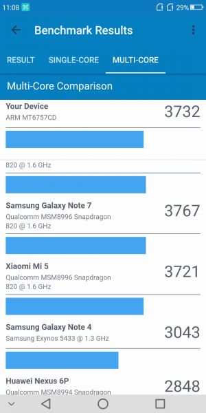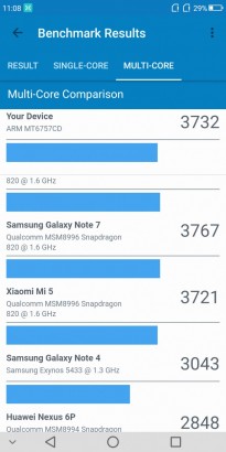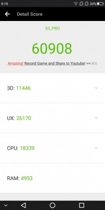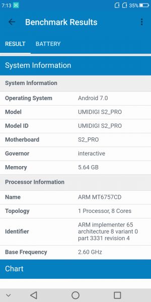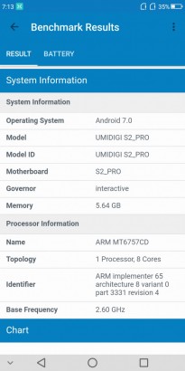 Umidigi S2 Pro выглядит очень привлекательно, идеально лежит в руке, но имеет ряд не слишком серьезных недостатков, о которых уже было сказано выше. Если ставить это на «весы», то дизайн все-же превосходит отсутствие 3,5 мм порта, что и без того приносит свою «изюминку», с небольшим «яблочным» послевкусием. Дисплей Одна из самых заметных деталей смартфона произведена компанией SHARP. Это TDDI In-cell экран с диагональю 5,99 дюймов с мультитачем рассчитанным на 5 одновременных касаний. Дисплей имеет разрешение 2160х1080 пикселей (FullHD+) и соотношение сторон 18:9, что позволяет с удобством смотреть фильмы «без полос», читать книги, либо серфить в сети Интернет. Настройки довольно обширные, однако неполные. К примеру, здесь используется технология MiraVision, где можно изменить яркость, контрастность и цветовую температуру. Размер шрифта имеет 4 позиции, среди которых обязательно найдется наиболее подходящий. А вот изменить масштаб интерфейса не представляется возможным. Соответствующего пункта попросту нет ни в разделе «Экран», ни в «специальных возможностях» телефона. Зато, здесь есть «Калибровка G-сенсора», «Трансляция», «Быстрый доступ к камере», «Калибровка датчика приближения» и «S View Cover Setting», который, видимо можно докупить к этому аппарату. При всем этом разнообразии не сразу замечаешь, что «защита глаз» вынесена отдельным пунктом в общем меню настроек, хотя она по сути является частью функционала «MiraVision». Зачем так сделано – не понятно, но остается надежда, что в будущих обновлениях производитель наведет порядок, ведь это устройство позиционируется как флагман, да и стоит 280 долларов, а значит должно соответствовать цене не только внешним видом, но и функционалом. В остальном, экран здесь и правда отличный. Идеальные углы обзора, высокий запас яркости, автоматическая регулировка освещения, неплохое олеофобное покрытие и каленное стекло Corning Gorilla Glass 4 делают свое дело. Такой дисплей правильно передает цвета и не слишком блекнет под прямыми солнечными лучами. Картинка получается насыщенной и красочной, а чтение и просмотр видео могут принести лишь удовольствие. Аппаратная часть Традиционно для Umidigi в S2 Pro используется процессор от MediaTek. Это восьмиядерный Helio P25, построенный на 16 нм процессе, с легкостью сравнимый с Snapdragon 625 на 14 нм. Последнему он проигрывает разве что в энергоэффективности, но вряд ли слишком сильно. Тактовая частота ядер Cortex-A53 составляет 1,6 ГГц (до 2,5 ГГц в разгоне). Процессор вместе с графическим чипом Mali-T880 MP2 на 0,9 ГГц и шестью гигабайтами ОЗУ способен справиться с любой задачей. Флагманские характеристики этого устройства имеют огромный задел на будущее, ведь редко какие приложения сейчас используют более 2Гб оперативной памяти, а значит перед нами просто настоящий мультимедийный монстр, который и далее сможет быть надежным помощником, способным выполнять все задачи. Традиционно, в мультиоконный режим можно перейти длинным нажатием на «последние приложения», где нужно выбрать все подходящие этому режиму элементы. Стоит помнить, что не все программы способны работать таким образом, ведь некоторым нужна полная «монополия» экрана, например, камере. Если подобный функционал недоступен это будет отображено прямо на шорткате программы, потому путаница возникнуть не должна. Управление интуитивно понятное, сопровождается подсказкам