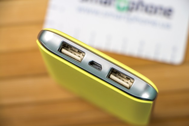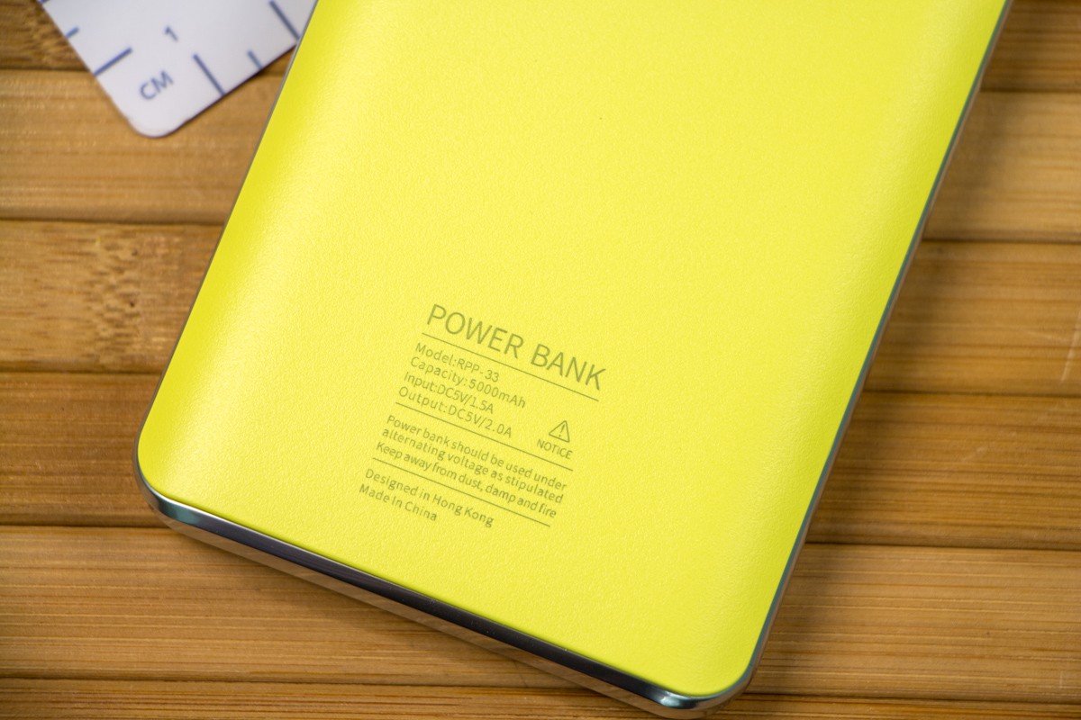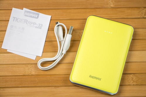 Tiger RPP-33 Tiger RPP-33, бесспорно, среди тестируемых моделей в плане внешности самый яркий. Во-первых, корпус тестового экземпляра окрашен в красивый лимонный цвет. Есть также варианты в белом, розовом и голубом. Во-вторых, помимо матового пластика с точечной текстурой на лицевой части и обычной на тыльной, в качестве материала для «боковушек» используется гладкий металл. На правом торце обустроена кнопка питания, а на верхнем, где металл вогнут внутрь, microUSB-разъем для зарядки аккумулятора и два стандартных USB-порта для подзарядки мобильных устройств c выходным током на 1.5А и 2А. Именно возможность «питания» сразу двух гаджетов выделяет Tiger RPP-33 на фоне, к примеру, того же Remax RPP-17, ведь емкость у них идентична – 5000 мАч. Чтобы зарядить Tiger RPP-33 на 100% понадобится не меньше 4 часов. Об уровне заряда просигнализируют четыре голубых LED-индикатора на его передней панели. 1 светящаяся лампочка – "пауэрбанк" заряжен на 0-24%; 2 – на 25-49%; 3 – 50-74%; 4 – 75-100%. Мне одного полного заряда аккумулятора хватило на следующее: