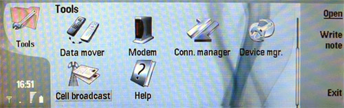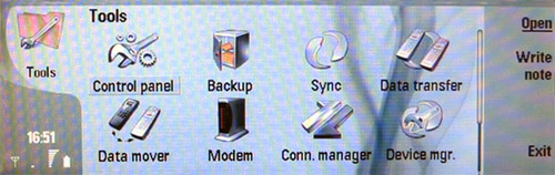 В меню Tools находится множество различных иконок: Control Panel (здесь осуществляются все настройки телефона, такие как яркость дисплея, мелодия вызова, интернет настройки и многие другие), Backup (копирование и восстановление данных при помощи карты памяти), Sync (синхронизация с компьютером), Data Transfer (перенос информации с одного коммуникатора Nokia 9500 на другой), Data Mover (перенос информации из старого коммуникатора в новый, например из 9210, в 9500), Modem (включается функция использования телефона, как модема), Connecting Manager (менеджер соединений), Device Manager (менеджер устройств), Cell Broadcast (информация сети) и Help.