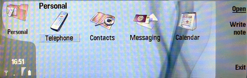 При нажатии на иконку Personal, нам открывается подменю, состоящее из пунктов Telephone (в этом подпункте можно выбрать номер и позвонить по нему или отправить сообщение), Contacts (просмотреть контакты), Messaging (прием/отправка SMS сообщений и сообщений электронной почты) и Calendar.