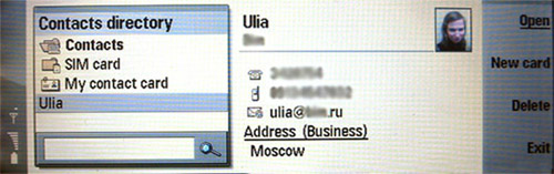 В контактах, информация о человеке может быть представлена очень широко. Может быть записано несколько телефонных номеров, несколько адресов e-Mail, домашний и рабочий адреса, так же к контакту можно прикрепить фотографию, которая высвечивается при звонке (я очень удивился, что при закрытом телефоне эта функция не работает).