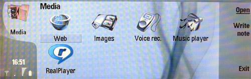 E-Mail клиент работает превосходно, телефон поддерживает все кодировки и прекрасно справляется с аттачментами.љ В пункте под названием Media можно найти иконкиWeb (интернет браузер),Images (просмотр фотографий и картинок),VoiceRec. (диктофон),MusicPlayer (MP3 плеер) иRealPlayer (плеер видео файлов форматаRealOne).