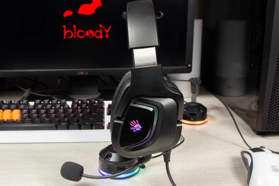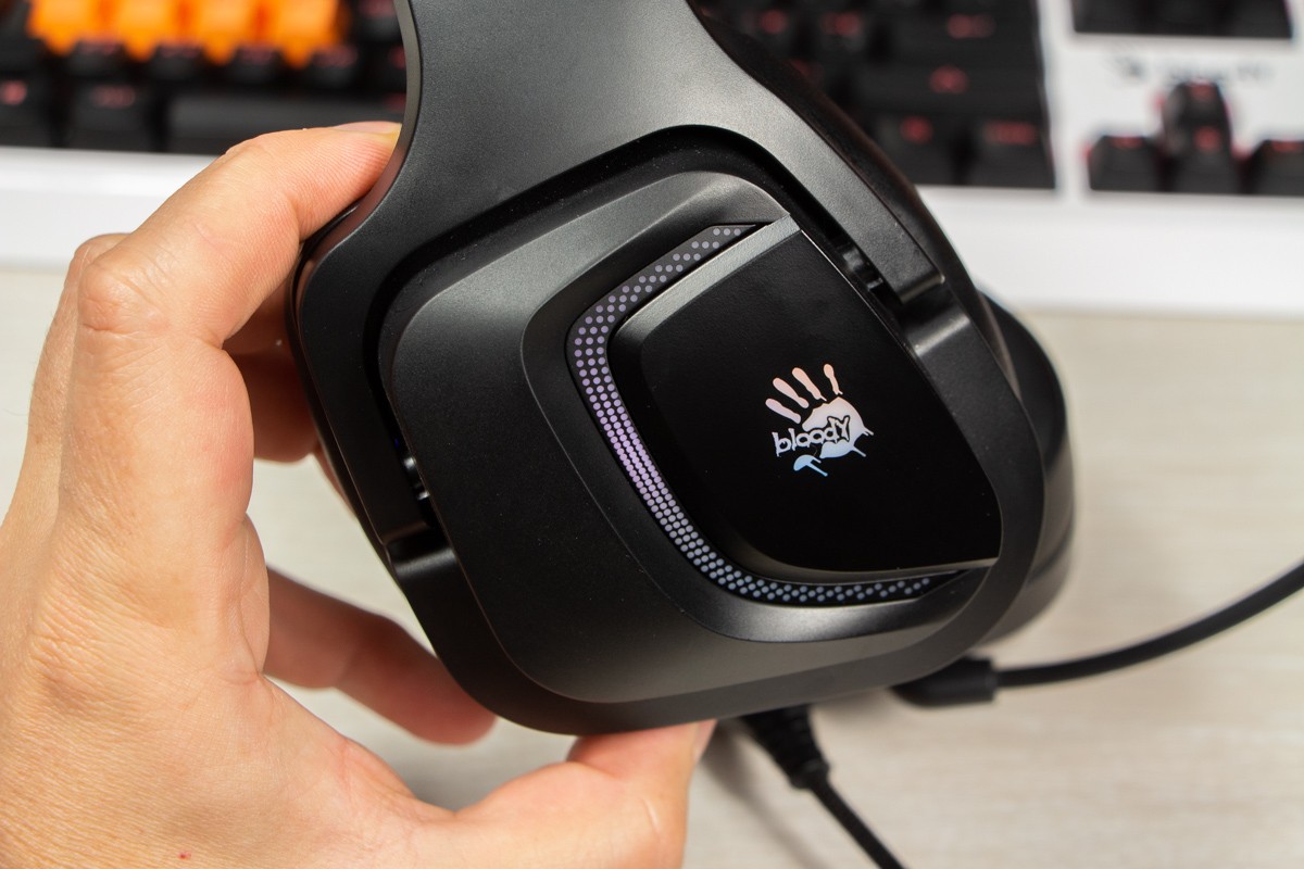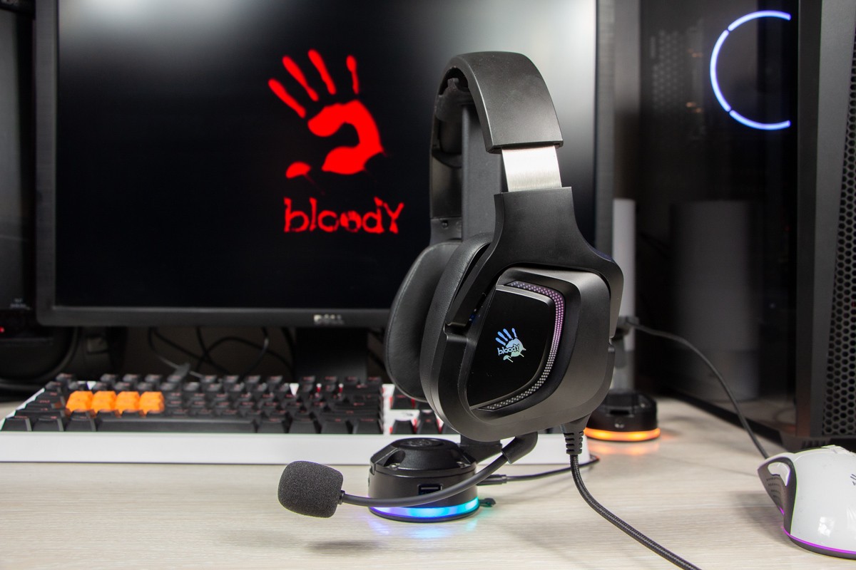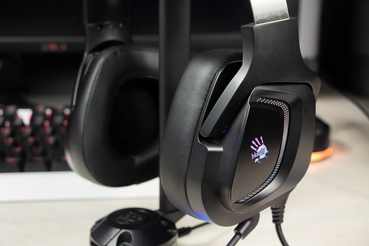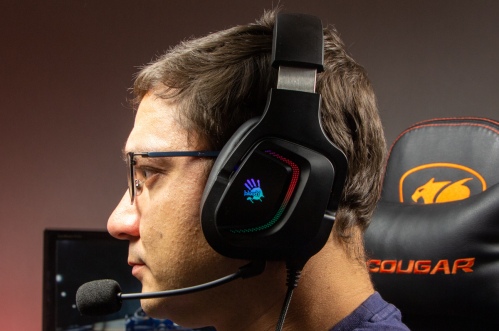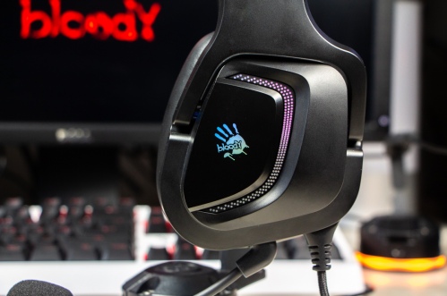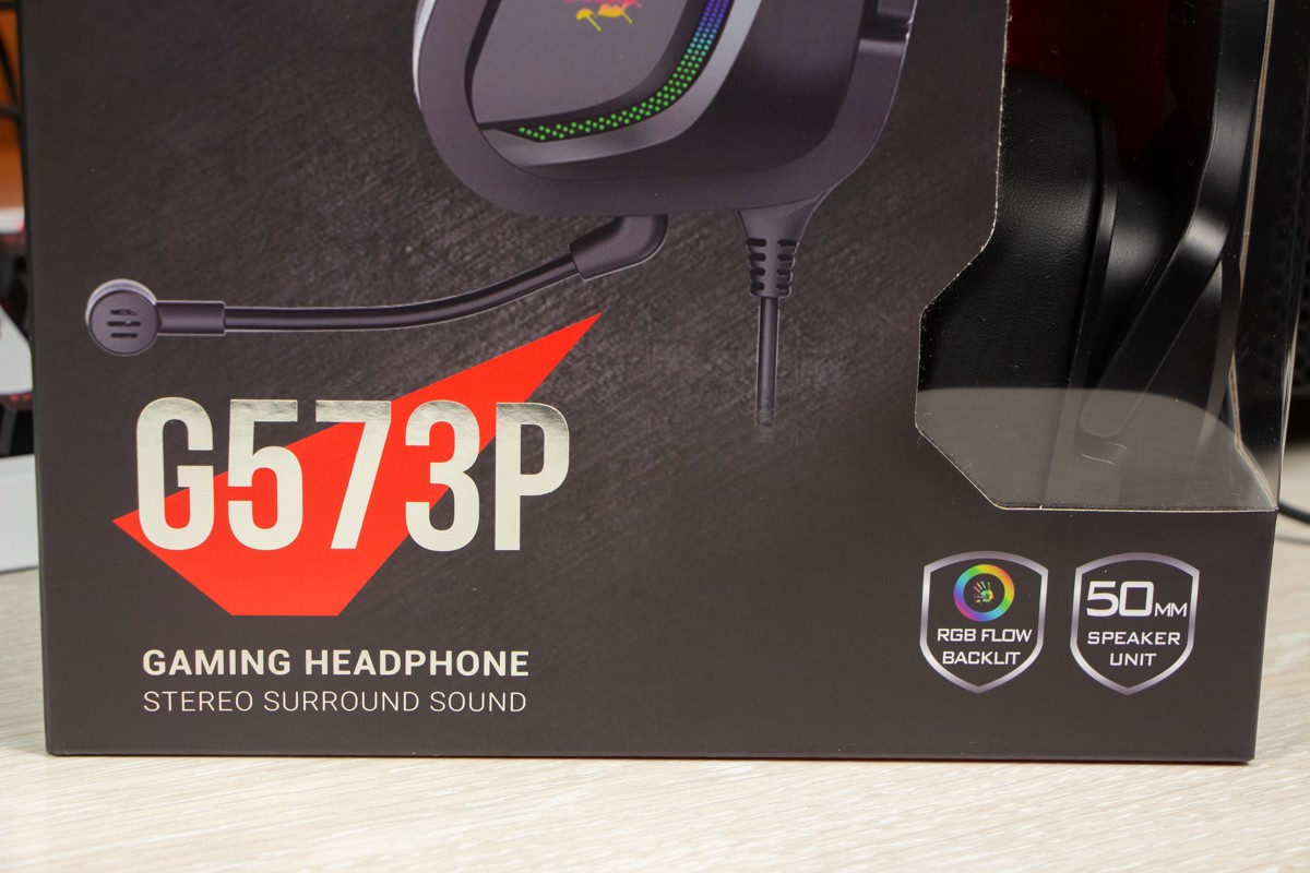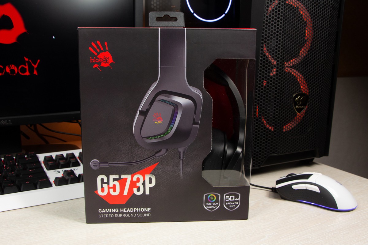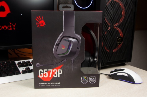 Огляд ігрових навушників A4Tech Bloody G573P: RGB підсвічування та хороший звук по прийнятній цініНаразі кожен виробник ігрових аксессуарів має у свої лінійці навушники-гарнітуру, яка доповнена RGB підсвічуванням. У A4Tech та їх ігрового бренду таких моделей багато і користувачу є з чого вибирати як по дизайну, так і по якості звучання. Останнє найбільше впливає на ціну. Як виявилось, модель Bloody G573P хоч і має невисокий цінник, але звучить добре і по-своєму цікаво. Подробиці і враження від пристрою дізнаєтесь з огляду. Комплектація Коробка з пристроєм по фірмовому яскрава та інформативна. З важливого у комплект до Bloody G573P виробник додав перехідник для підключення до ПК та мікрофон, що знімається. Дизайн і Корпус Модель G575 від Bloody по розмірах можна віднести до великих повнорозмірних ігрових навушників, які призначені для використання вдома або в офісі. Габарити 170 х 195 х 100 мм. При цьому, незважаючи на розміри, модель вийшла досить легкою - 288 г (341 г разом с кабелем і пультом). Метал в конструкції використовується в дужці, що з’єднує вуха. Пластику багато, але він якісний і товстий. Переплутати пристрій з цього огляду з навушниками від іншого виробника складно через наявність логотипів Bloody, які додаткого отримали RGB підсвічування. Якщо не підключати USB кабель, то світитись нічого не буде. Як на мене, то виробник знайшов правильний та достатній баланс між площею підсвічування та яскравістю. Додатково уточню, что підсвічування змінює свій колір в широкому діапазоні кольорів. Налаштувати його під себе можливості немає. Зон підсвічування дві. Дужка може змінювати свої розміри не більше ніж на 2,5 см з кожної сторони. Фіксація в проміжних положеннях хороша. Під дужкою передбачено ергономічний елемент, наповнений м’яким наповнювачем. Завдяки цьому навушники легко підлаштовуються під форму голови. Чашки з ободом з'єднані рухомим кріпленням. На голову пристрій сідає без нюансів, навіть якщо вона невелика. Амбушюри товсті, мають ефект пам'яті, виготовлені з екошкіри, приємні на дотик. Якщо робити проміжний висновок по корпусу, то у мене без претензій. Навушники не тиснуть ні конструкцією, ні вагою. Кабель підключення довжиною 2 метри має обплетення з тканини. На ньому розмістили пульт управління з регулятором гучності і вимикачем мікрофона. На кінці кабелю 3,5 мм аудіо конектор і USB конектор для подачі живлення на підсвітку. Звучання Основні характеристики Bloody G573P по звукуНавушники: