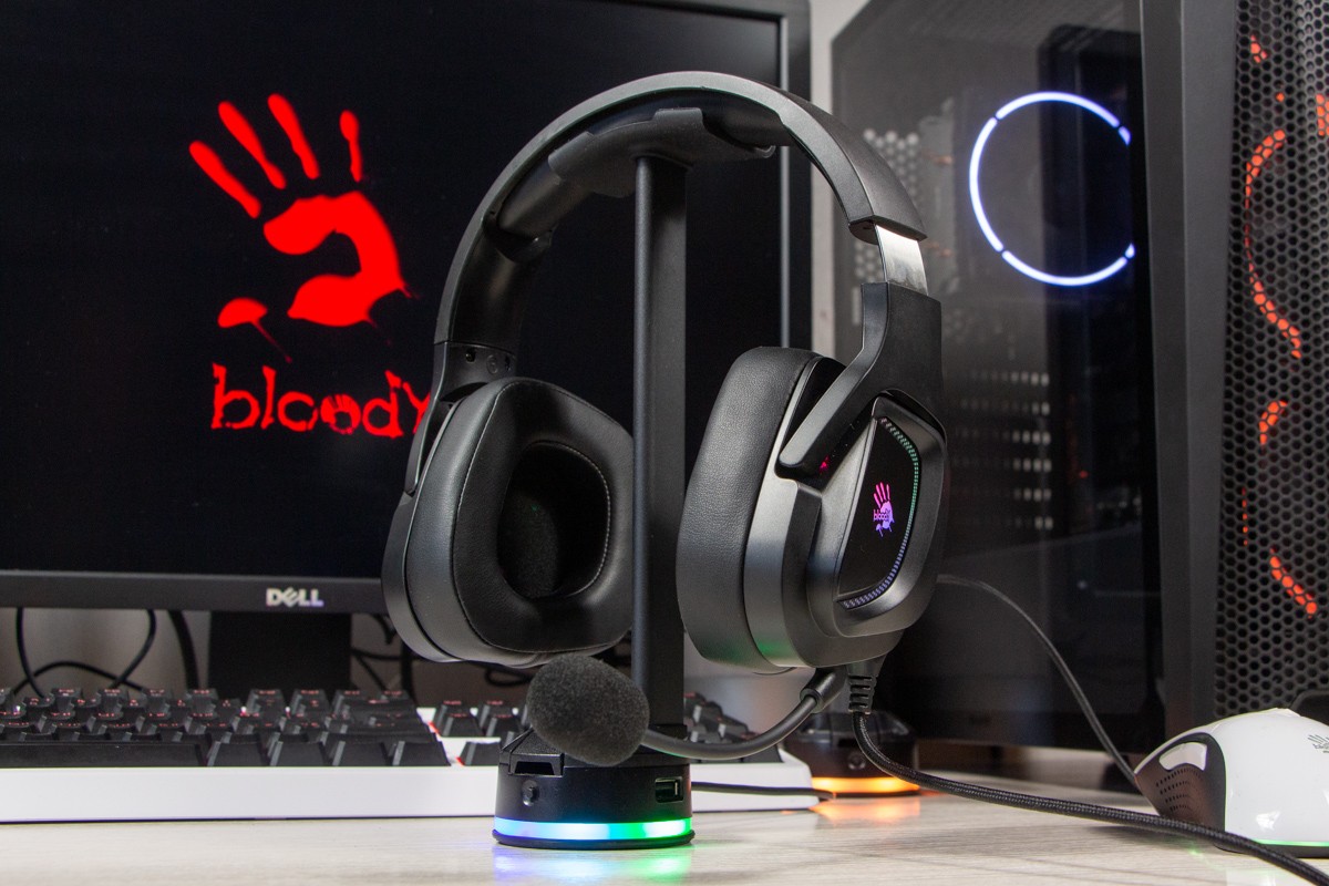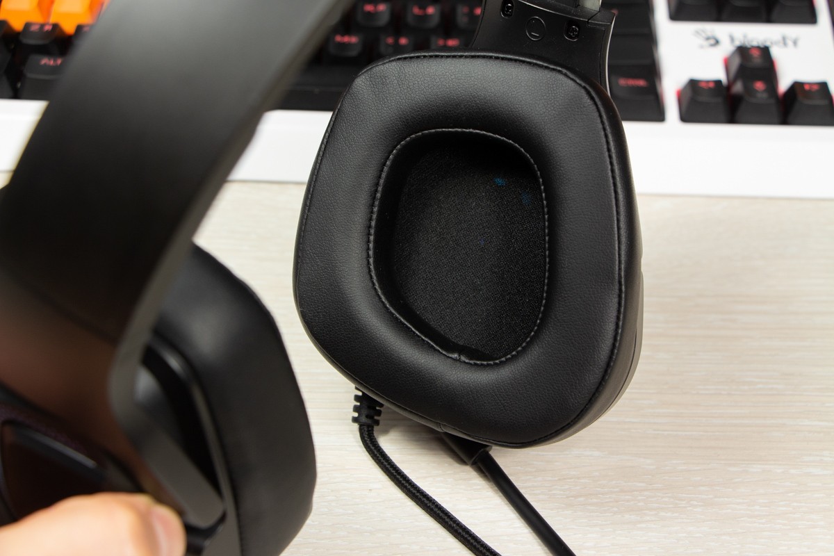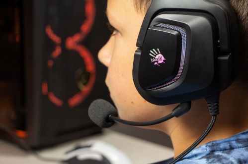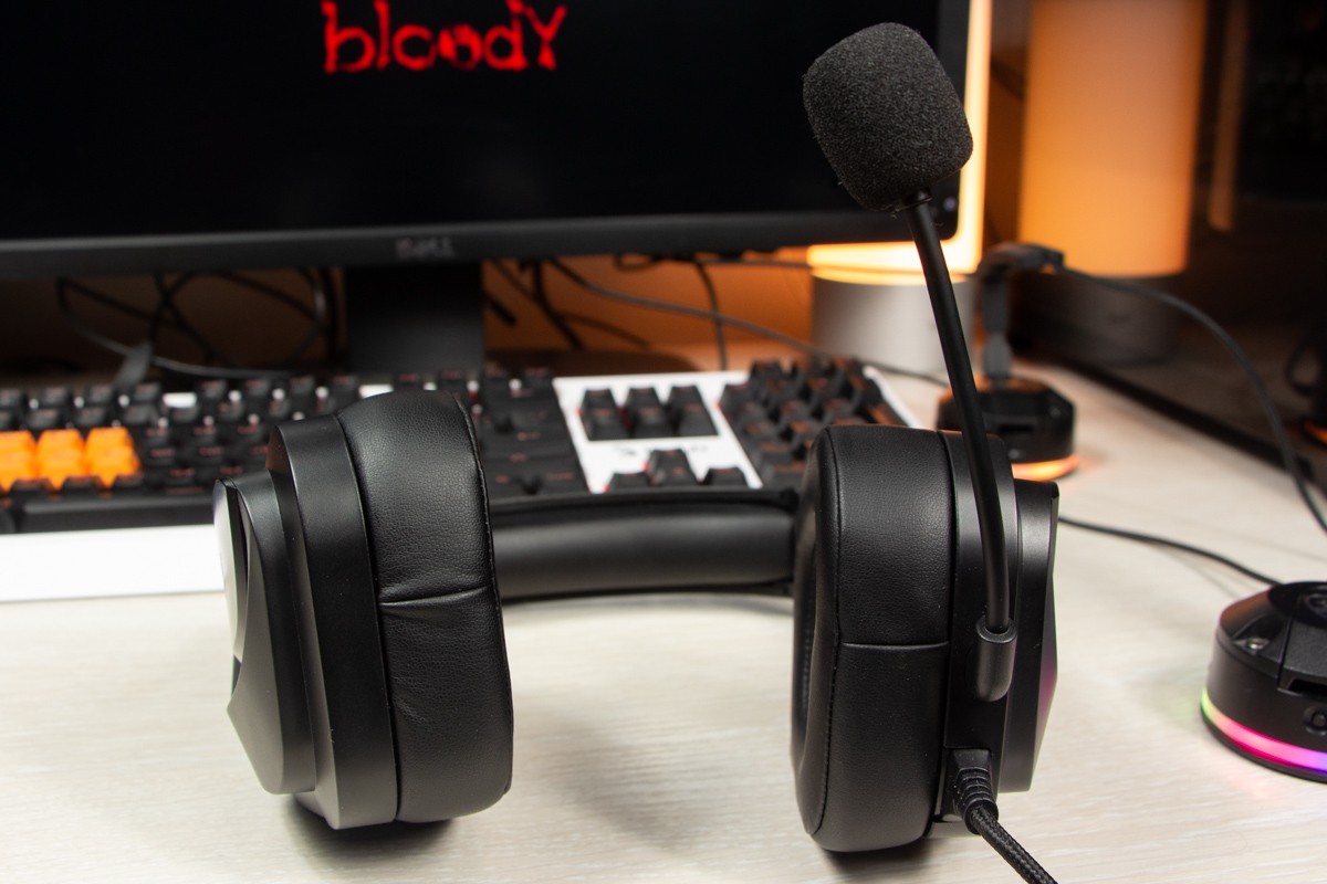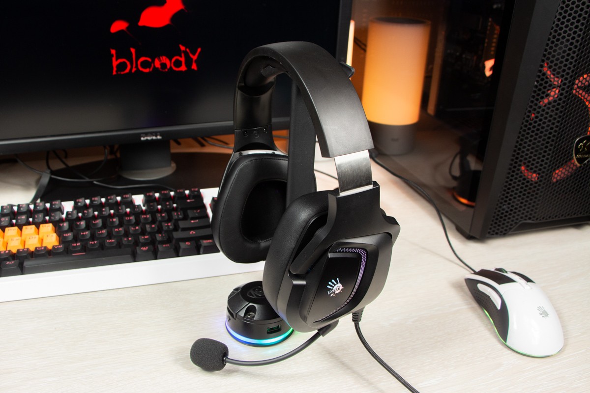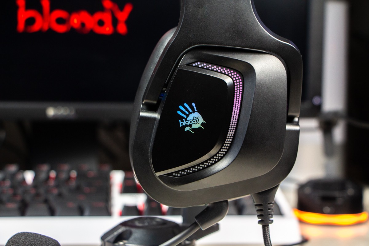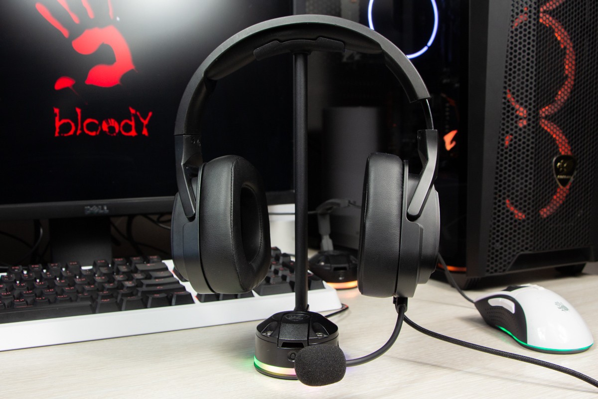 Огляд ігрових навушників A4Tech Bloody G573P: RGB підсвічування та хороший звук по прийнятній цініНаразі кожен виробник ігрових аксессуарів має у свої лінійці навушники-гарнітуру, яка доповнена RGB підсвічуванням. У A4Tech та їх ігрового бренду таких моделей багато і користувачу є з чого вибирати як по дизайну, так і по якості звучання. Останнє найбільше впливає на ціну. Як виявилось, модель Bloody G573P хоч і має невисокий цінник, але звучить добре і по-своєму цікаво. Подробиці і враження від пристрою дізнаєтесь з огляду. Комплектація Коробка з пристроєм по фірмовому яскрава та інформативна. З важливого у комплект до Bloody G573P виробник додав перехідник для підключення до ПК та мікрофон, що знімається. Дизайн і Корпус Модель G575 від Bloody по розмірах можна віднести до великих повнорозмірних ігрових навушників, які призначені для використання вдома або в офісі. Габарити 170 х 195 х 100 мм. При цьому, незважаючи на розміри, модель вийшла досить легкою - 288 г (341 г разом с кабелем і пультом). Метал в конструкції використовується в дужці, що з’єднує вуха. Пластику багато, але він якісний і товстий. Переплутати пристрій з цього огляду з навушниками від іншого виробника складно через наявність логотипів Bloody, які додаткого отримали RGB підсвічування. Якщо не підключати USB кабель, то світитись нічого не буде. Як на мене, то виробник знайшов правильний та достатній баланс між площею підсвічування та яскравістю. Додатково уточню, что підсвічування змінює свій колір в широкому діапазоні кольорів. Налаштувати його під себе можливості немає. Зон підсвічування дві. Дужка може змінювати свої розміри не більше ніж на 2,5 см з кожної сторони. Фіксація в проміжних положеннях хороша. Під дужкою передбачено ергономічний елемент, наповнений м’яким наповнювачем. Завдяки цьому навушники легко підлаштовуються під форму голови. Чашки з ободом з'єднані рухомим кріпленням. На голову пристрій сідає без нюансів, навіть якщо вона невелика. Амбушюри товсті, мають ефект пам'яті, виготовлені з екошкіри, приємні на дотик. Якщо робити проміжний висновок по корпусу, то у мене без претензій. Навушники не тиснуть ні конструкцією, ні вагою. Кабель підключення довжиною 2 метри має обплетення з тканини. На ньому розмістили пульт управління з регулятором гучності і вимикачем мікрофона. На кінці кабелю 3,5 мм аудіо конектор і USB конектор для подачі живлення на підсвітку. Звучання Основні характеристики Bloody G573P по звукуНавушники: