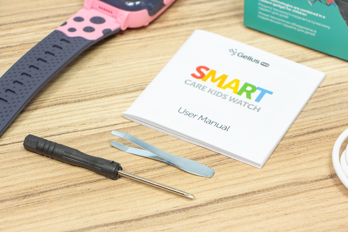 Виконаєте вище зазначені рекомендації і процес знайомства та налаштування годинника не викличе ніяких складнощів. Тим паче, що про все інше виробник заздалегідь подбав. У комплекті з Gelius Pro Care знайдете: кабель для підзарядки, пінцет для встановлення nanoSim картки, викрутку з додатковою парою гвинтів, доволі інформативну інструкцію та гарантійний талон. Дизайн та Корпус Gelius Pro Care – годинник у привабливому дитячому дизайні. Дитячим його робить колір корпусу та ремінця. У виробника є повністю чорний варіант, а є такий як на огляді світло рожевий із темно фіолетовим. До мене на огляд потрапив більш дівчачий варіант. Корпус добре зібраний, легкий (55 г разом з ремінцем), а от габарити (55 х 41 х 16 мм) меншими навряд чи можна було б зробити, щоб вмістити камеру і динамік. Ремінець зручний та з приємного для шкіри матеріалу. Вагома перевага корпусу – наявність захисту по стандарту IP65. Це не означає, що в годиннику можна приймати ванну чи купатись у річці, але корпус вбереже внутрішню електроніку від попадання вологи під час випадкового потрапляння під дощ або під час миття рук. Дисплей Екран у дитячого смарт-годинника не для ігор, а для важливих справ, тому діагоналі в 1.3 дюйми якраз достатньо, що балансувати між прийнятними для дитячої руки габаритами корпусу та розміром дисплею, на якій відображається інтерфейс. Роздільна здатність екрану - 240х240 пікселів. Він квадратний і сенсорний. Навіть великими пальцями дорослого ним зручно користуватись. Я зміг ввести пароль до Wi-Fi з першого разу та без помилок. Підсвітка має декілька ступенів яскравості, а у найвищому її достатньо для зчитування інформації навіть у сонячний день. Апаратна складова В цьому розділі перерахую компоненти, які використав виробник.