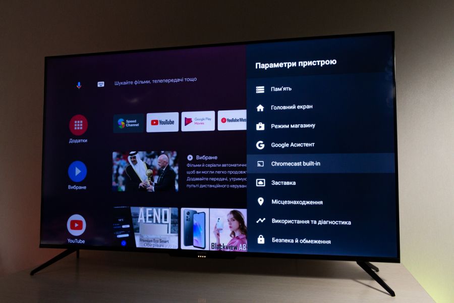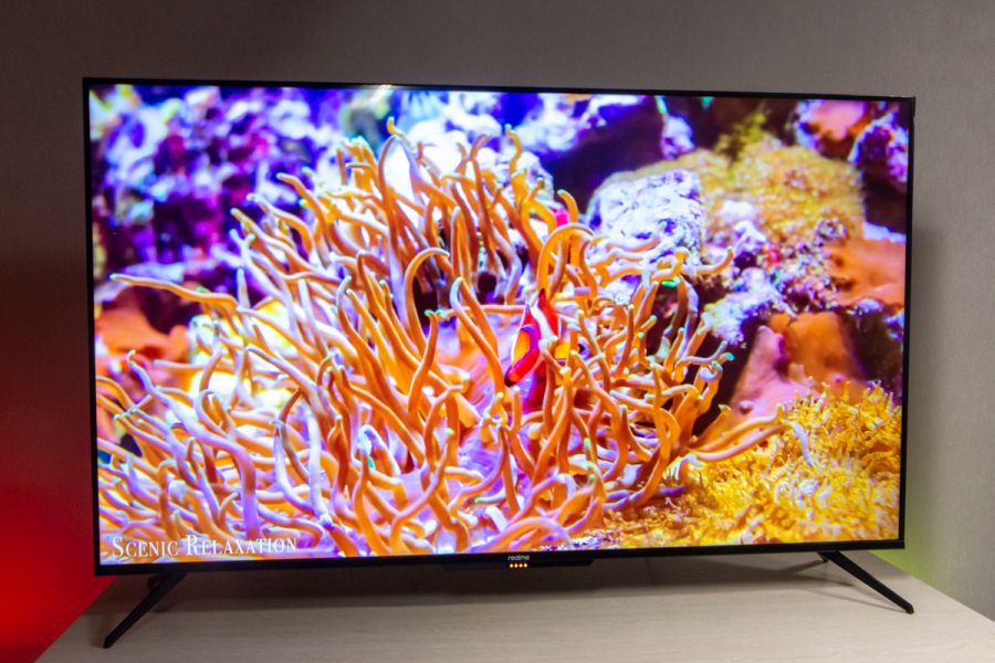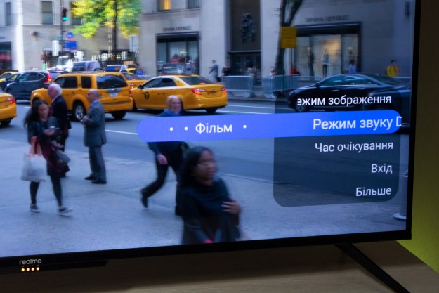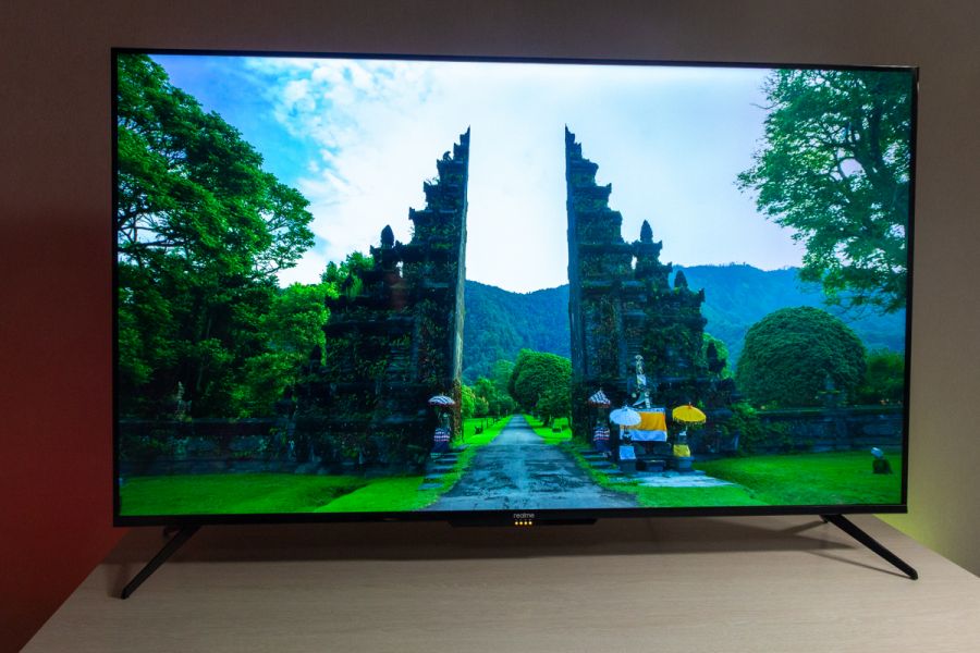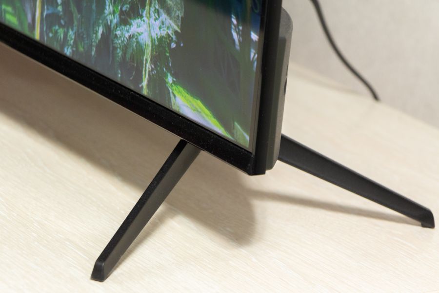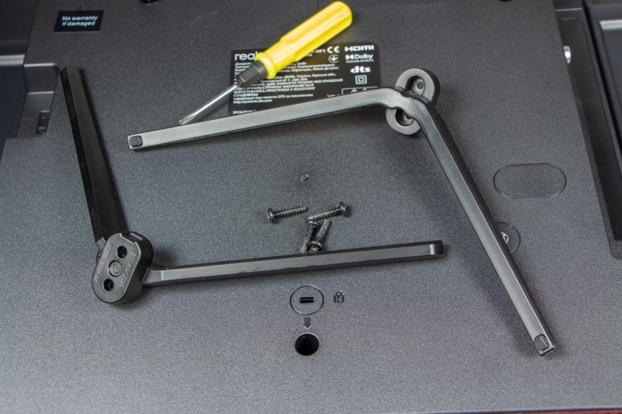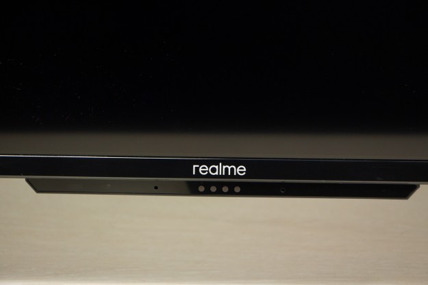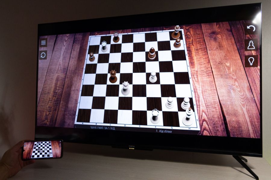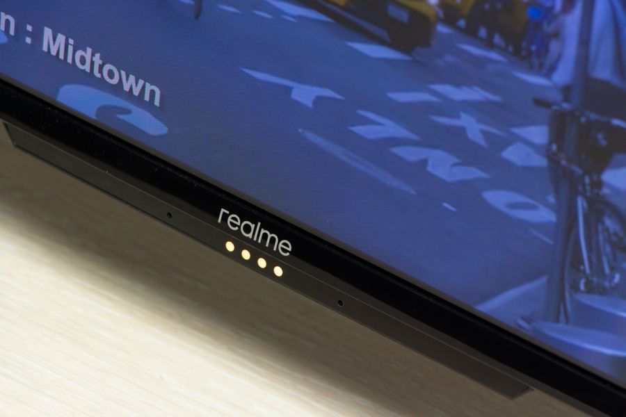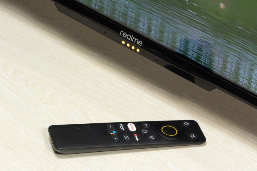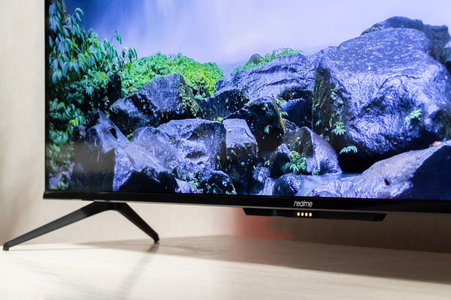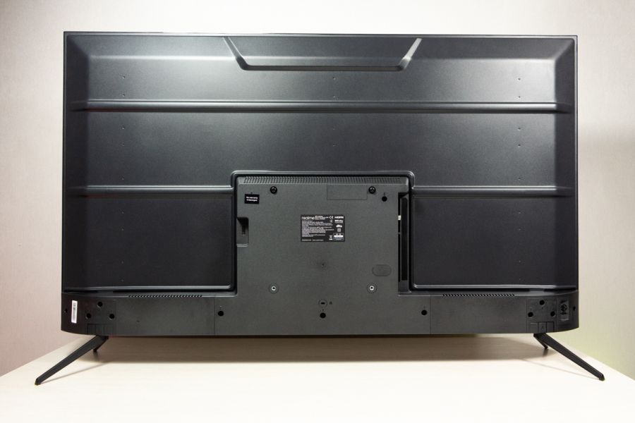 Пристрій виявився досить легким, особисто я міг його транспортувати самостійно без сторонньої допомоги. Розпакування та встановлення ніжок по часу зайняло хвилин 5. А далі лишись лише увімкнути ТВ в розетку, увімкнути, вибрати свій регіон, додати акаунт Google і почати насолоджуватись переглядом контенту на великій діагоналі. Габарити (ШхГхВ): 1110 х 75 х 647 мм. Вага 9,2 кг. Дизайн та Корпус Почну з того, що підставка зроблена дуже ергономічною і її намагались максимально вписати в габарити телевізора по товщині – аби вона не мінімально виступала за його межі. Це дозволяє розмістити пристрій навіть на полицях, що менші за ширину корпусу. Пластикові підставки здаються досить міцними та легко кріпляться. Також вони достатньо підіймають корпус, щоб користувач міг розмістити саундбар. Не хочете ніжок – можете повісити ТВ на стіну. Кріплення VESA, 20 см між посадковими різьбами. Задня панель телевізора повністю з пластику чорного кольору, як і всі інші панелі. Окрім портів на неї додали клавішу керування телевізором, яка може стати заміною пульту, якщо у ньому сіли батарейки. З кнопки можна увімкнути/вимкнути телевізор, налаштувати джерело сигналу і гучність, перемикати канали. Окремо зверну увагу на клавішу активації мікрофонів (для доступу до Google Assistant без використання рук). В лицьової сторони користувач бачить лише великий дисплей та тонку глянсову рамку знизу. Зверху та на боках рамка майже відсутня – товщина 2,6 мм. Внизу по центру ледве виділяється трапецивидна ділянка під яку додали індикатори стану мікрофонів «далекого поля», звичайних мікрофонів та індикатор живлення. Співвідношення екрану до корпусу 97,2%. Дизайн мінімалістичний, але занадто простим його не назвати, бо матеріали зовнішнього оздоблення якісні. Мені такий стиль подобається. Екран та враження від перегляду контенту За порівняно невисоку ціну покупець телевізора realme Smart TV з діагоналлю 50 дюймів отримує роздільну здатність 4K UHD (3840 x 2160), 1,07 мільярда кольорів, Dolby Vision. При цьому Chroma Boost Picture Engine від realme сприяє підвищеною яскравості, контрастності та насиченню зображення кольорами. Параметри екрана: