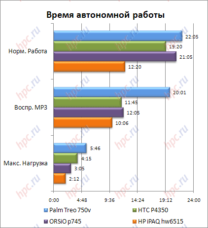 Видеосъемка доступна нам в одном режиме – 176х144. Качество видео нельзя настроить. Зато можно выбрать формат видео - 3GP или MP4. Кроме того, съемку можно проводить в беззвучном режиме. В целом, интерфейс для фото/видео съемки аскетичен и не особо удобен. Сделать «мгновенный снимок» чего-то интересного вам, скорее всего, не получится – так что готовьтесь заранее. Возможности камеры минимальны, качество обычное. Время автономной работыНапоминаем, что емкость комплектного аккумулятора ORSiO p745 составляет 1250мАч. Традиционно тестирование проводилось по общепринятой для нашего ресурса методике. 1. Режим максимальной нагрузки. Яркость подсветки выкручена на максимум, громкость динамика тоже, включены Wi-Fi и Bluetooth модули, через Windows Media Player в цикле воспроизводится "тяжелый" видеоролик. Во время воспроизведения коммуникатор дважды сообщал о том, что заряд заканчивается – в первый раз через 2 часа 15 минут, во второй раз - за 25 минут до полного разряда. Время автономной работы в этом режиме составило 3 часа 5 минут. 2. Чтение текста. Все беспроводные модули отключены. Яркость подсветки установлена на минимум. На коммуникаторе запущено чтение текста в предустановленной программе Haali Reader с автоматической прокруткой. Во время воспроизведения коммуникатор один раз сообщил о том, что заряд на исходе – за два часа до отключения. Время работы составило 21 час 05 минут. 3. Воспроизведение МР3. Wi-Fi и Bluetooth выключены. Яркость подсветки установлена на «минимум», автоотключение подсветки происходит через 30 секунд. Полностью отключить экран стандартными средствами не представляется возможным. Прослушивание идет через наушники, на максимальной громкости. Использовался стандартный Windows Media Player и композиция с постоянным битрейтом (192 Кб/c). Во время воспроизведения коммуникатор один раз сообщал о том, что заряд завершается – за 2 часа 40 минут до полного разряда. Общее время работы в таком режиме составило 12 часов 5 минут. Для коммуникатора с таким процессором это вполне ожидаемые результаты. В целом, в качестве mp3-плеера или читалки его можно вполне комфортно использовать. На приведенной диаграмме показано как выглядят результаты ORSiO p745 в сравнении с моделями других производителей, участвующих в нашем обзоре.