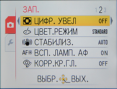 толку от неё не очень много. Дисплей достаточно большой. Работать с ним комфортно. Размер 2.7 дюйма, разрешение 230 000 пикселей. ![]() Отметим также наличие «Быстрого меню», которое позволяет достаточно комфортно получить доступ к необходимым настройкам. Таким как стабилизация изображения, серийная съемка, режим работы автофокуса, баланс белого, ISO, разрешение, яркость дисплея. ![]() ![]() ![]() ![]() Снимать