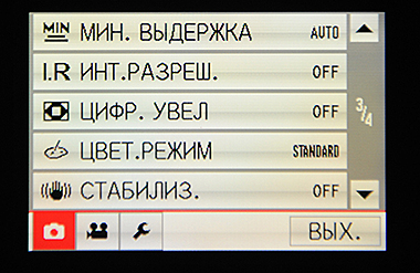 Это очень полезно и чрезвычайно мною приветствуется. В быстром меню доступны следующие параметры: - Качество видео; ![]() - Разрешение фотографий; ![]() - Оптическая стабилизация (доступны два уровня оптической стабилизации); ![]() - Баланс белого; ![]() - Цветовой режим; ![]() ![]() ![]() ![]() ![]() ![]() ![]() ![]() - Интеллектуальная экспозиция (оптимизирует экспозицию для каждой из частей кадра, предотвращая появление затенений и бликов); ![]() ![]() ![]() - Интеллектуальное разрешение (повышение качества и четкости мелких деталей); ![]() ![]() ![]() ![]() - ISO (Светочувствительность). ![]() Попробуем теперь камеру в работе. Как