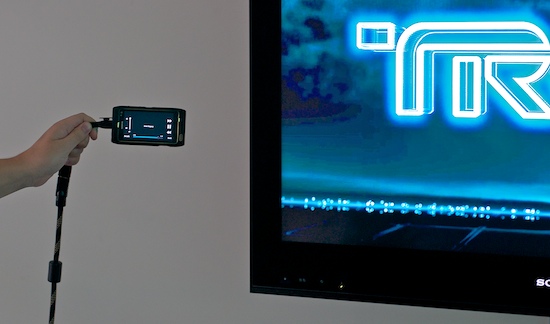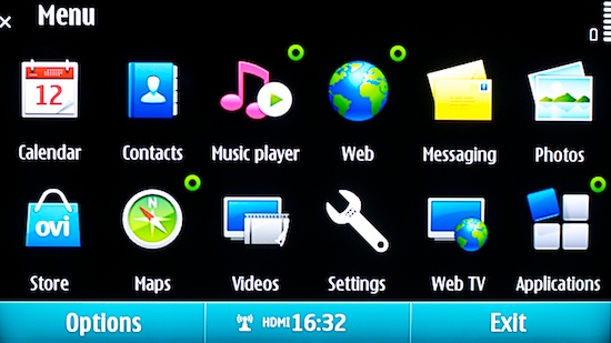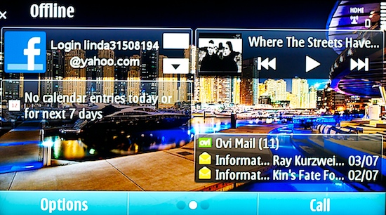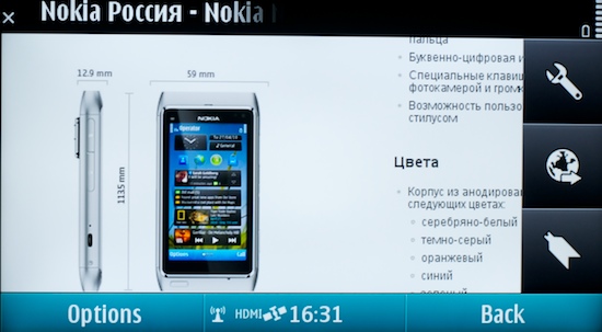Евгений Лукьянчиков, менеджер по продуктам Nokia, проводивший демонстрацию, подсоединил один из телефонов к висящему на стене телевизору и объяснил, что это самая что ни на есть штатная функция телефона. Мало того, в комплект поставки специально для этого входит переходник на HDMI. На телевизоре появляется копия интерфейса телефона, точь-в-точь то, что можно увидеть, повернув N8 в ландшафтный режим, только, конечно, куда крупнее. Зачем подключать телефон к телевизору? Ответ быстро становится понятен - для демонстрации возможности воспроизведения видео на телефоне запускается проигрывание трейлера фильма. Надо признать, что видео, воспроизводимое с телефона впечатляет: разрешение 720p и настоящий объёмный звук, получаемый телевизором по HDMI, вполне могут тягаться с каким-нибудь бытовым плеером. Во время особенно динамичных сцен картинка слегка подтормаживает, но при просмотре целого фильма это вряд ли будет заметно - там плотность потока пониже.