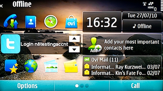После "киносеанса" знакомимся с остальными возможностями телефона. На главном экране расположены ярлыки самых важных приложений и виджеты: часы, дата, последние электронные сообщения и даже "Твиттер" (он, правда, в тестовой версии не работал).