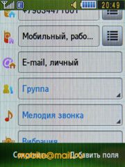При этом есть опция «Добавить поля», где вы можете задать несколько десятков других данных, вплоть до личного адреса, должности, индивидуальной мелодии для сообщения. Типов номера телефона 6, это Домашний; Мобильный; Рабочий; Факс; Видеовызов и Другой, таким образом контакту можно присвоить шесть типов номера, два электронных адреса, соотнести с тремя группами, присвоить картинку (снимок сделанный телефоном, картинку или аватар), персональную мелодию вызова (можно добавить видеоролик, ограничения соответствуют плеерным), персональный тип вибрации (5 вариантов), мелодию сообщения, указать домашнюю страницу, добавить день рождения и годовщину, которые при желании соотнести с календарем. И это далеко не полный список действий. ![]()