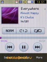 настройка, просто необходимо указать свои параметры, и только. Web-браузерБраузер в аппарате – Samsung Mobile Browser v0.8, основанный на Webkit open source project. Как и Motorola, Nokia, корейцы отдали разработку браузера на open source, в результате чего получился отличный, удобный и функциональный продукт. Ранее в аппаратах компании использовался NetFront, он явным образом уступает современному браузеру. ![]() Имеется RSS-закладки, отдельный ярлык Google, который открывает подменю с поиском, картами, почтой, блогами и YouTube. Очень приятной особенностью является поддержка flash в браузере – значимое дополнение. А вот масштаба страницы может быть только два варианта, и то один из них предназначен лишь для обзора содержания, разобрать текст не получится. Все слишком мелко. Изменение масштаба происходит двойным тапом по экрану, тут все стандартно. ![]() Просматривать страницы можно как в портретном, так и пейзажном режиме, для этого предусмотрен датчик движения, который работает вполне корректно. При этом на экране могут оставаться или же быть спрятанными иконки, когда вся область экрана используется для просмотра (полноэкранный режим). Не выходя из браузера можно отправить URL с помощью сообщения или электронного письма, просмотреть историю или сохранить страничку. Есть удобный менеджер закладок, просмотр истории – в общем, все стандартные опции современных браузеров. Мультимедиа, MP3 плеерПлеер в телефоне хорошо прорисованный, эргономичный. Обложка альбома крупная, ее хорошо видно. В средней части дисплея отображается статусная информация, рейтинг композиции (можно назначить) и кнопки, отвечающие за включение воспроизведения вразбивку, повтора композиций, эквалайзера и так далее. Ниже – строка воспроизведения и три крупные клавиши управления воспроизведением. ![]() Предусмотрены плей-листы, сортировка по исполнителям, жанрам, альбомам и проч., а в целом плеер не вызывает никаких негативных эмоций. Он не самый функциональный, но удобный, логично организованный. Музыкальное меню можно конфигурировать по своему желанию, включив или выключив пункты в общем списке. Присутствуют эквалайзеры (9 штук), правда их число фиксировано, и добавить новые или отредактировать существующие не получится. ![]()