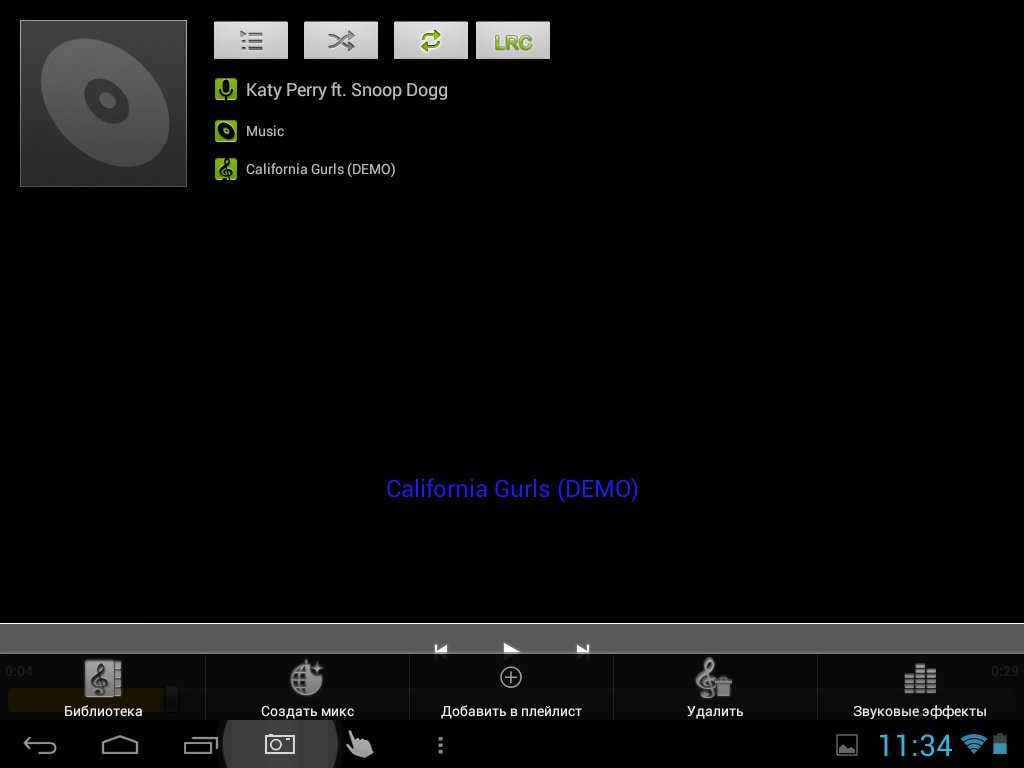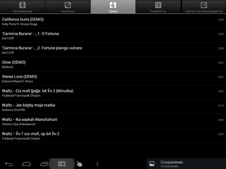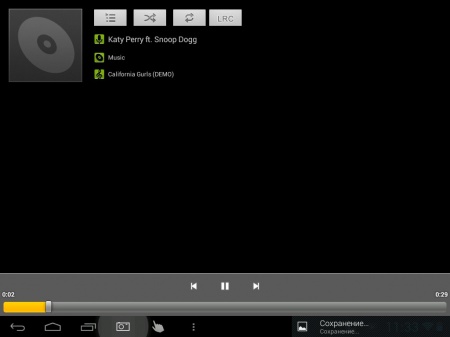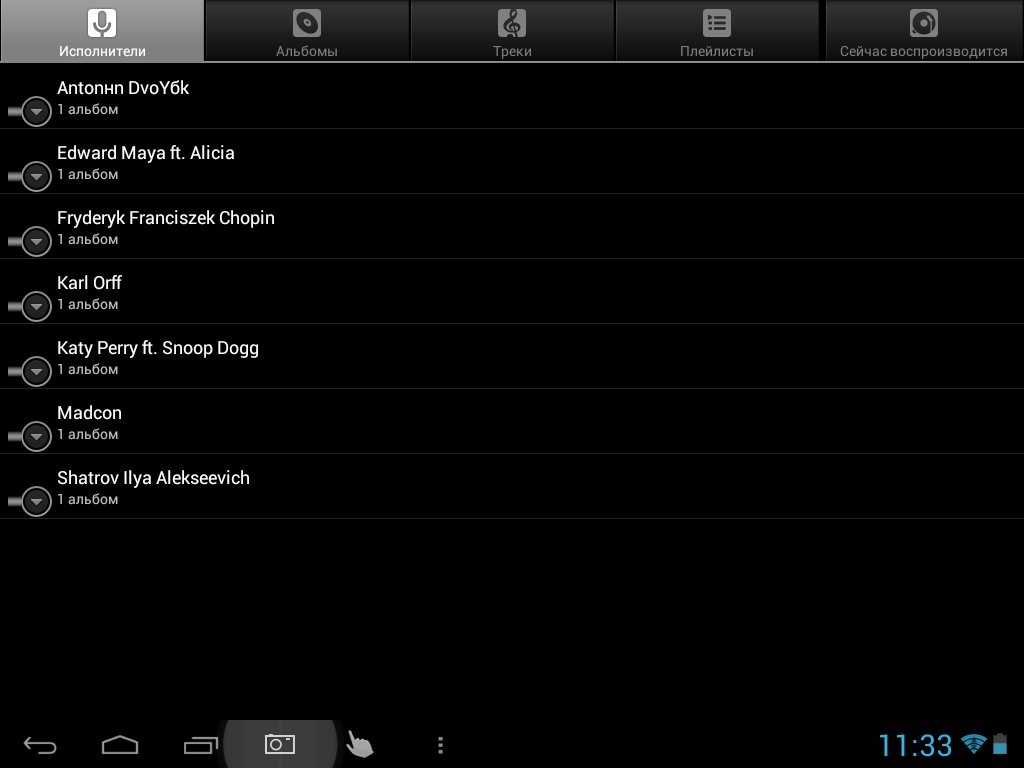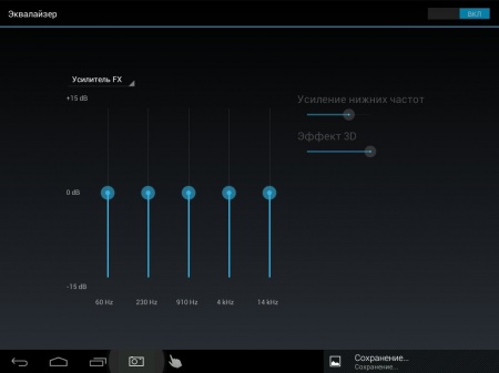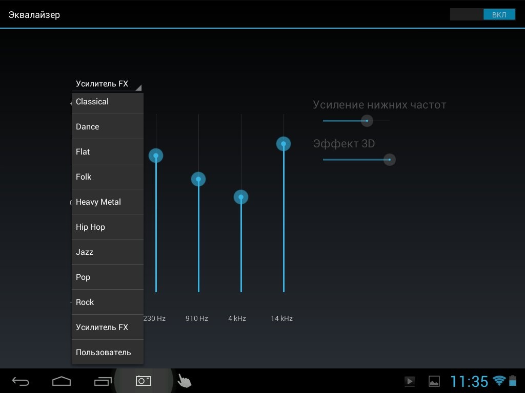 МР3-проигрыватель «штатный» Android-ный. Хорошо знакомый нам интерфейс, возможность сортировки треков по альбомам, плейлистам, а также исполнителям, настройки звука посредством нескольких предустановленных полос эквалайзера, а также с помощью шкалы усиления нижних частот и шкалы «Эффект 3D». Вот, пожалуй, и все.