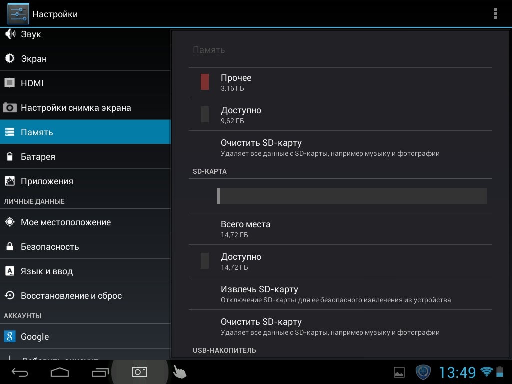 Заявленный объем встроенной пользовательской памяти 16 ГБ. Однако пользователь, как говорится, «на руки» получил чуть меньше 14 ГБ. Из этого объема около гигабайта – внутренняя память накопителя, а еще 12,97 ГБ – объем внутреннего FLASH-накопителя.