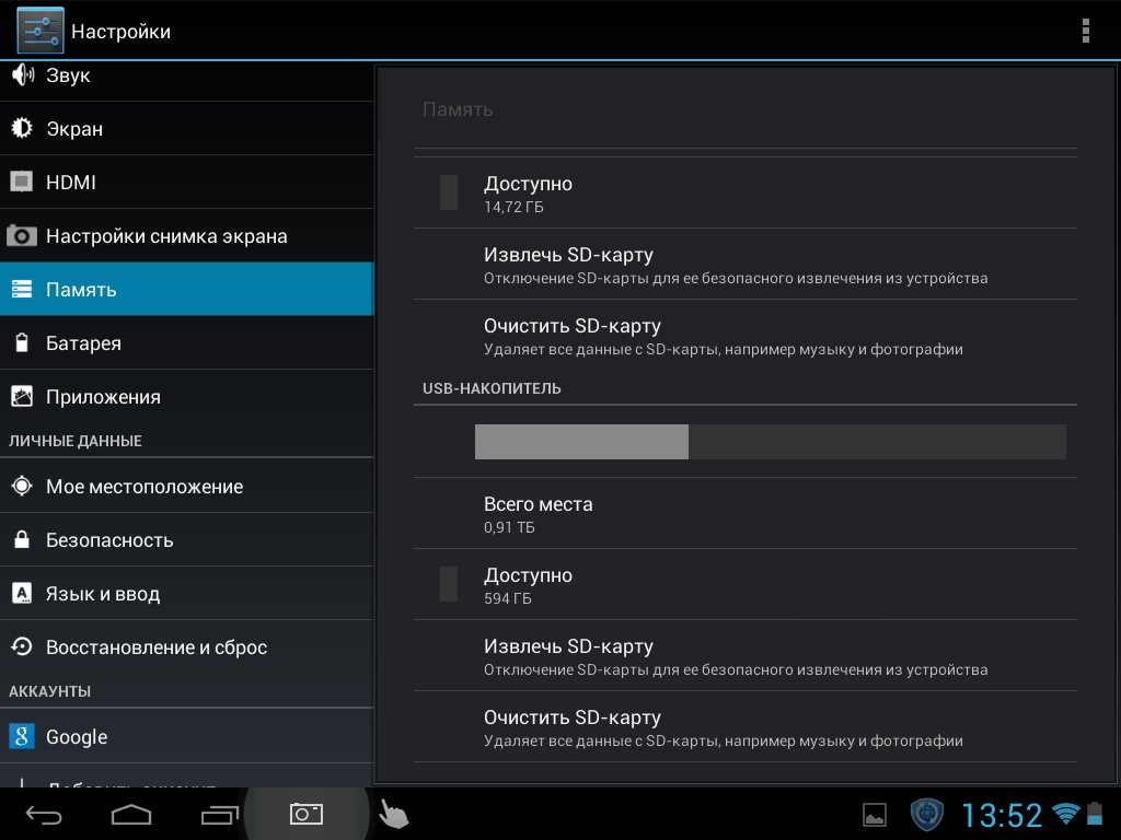 Но если суммарного объема в почти 50 ГБ пользователю окажется маловато, посредством кабеля USB OTG можно подключить даже терабайтный диск, как это сделал я. Добавлю, что фильм с разрешением Full HD у меня «шел» с этого диска без проблем.