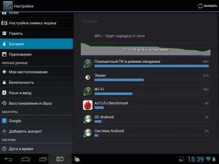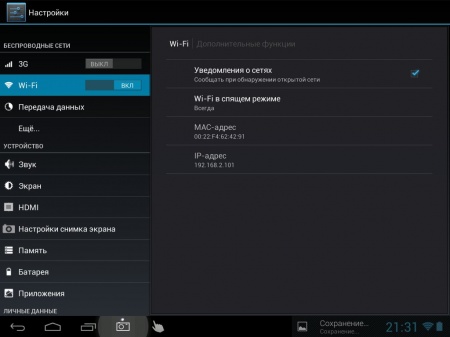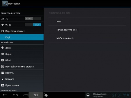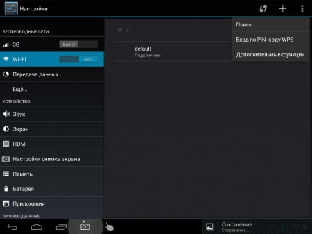 Модуль Wi-Fi 802.11 b/g/n кроме стандартных особенностей предлагает также возможность входа по PIN-коду WPS. Кроме того, в коммуникационном плане отмечу поддержку VPN и возможность создать точку доступа на базе своего планшета.