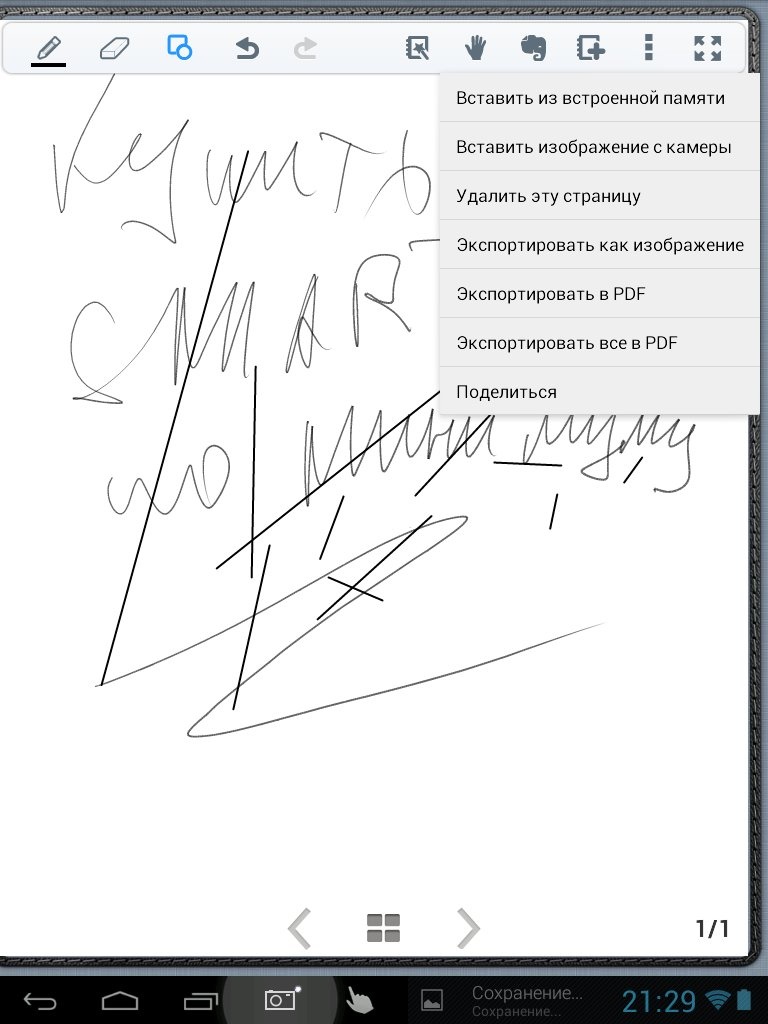 Стоит, наверное, обратить внимание и на подменю, обозначенное тремя вертикально ориентированными точками. Отсюда пользователь может вставить (?) из встроенной памяти, а также изображение из камеры, удалить страницы, экспортировать, как изображение либо же конвертировать в PDF и многое другое.