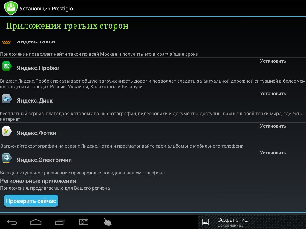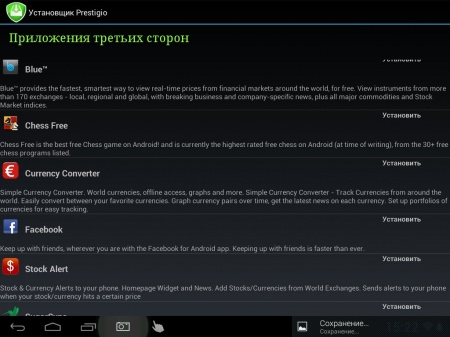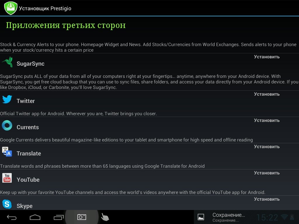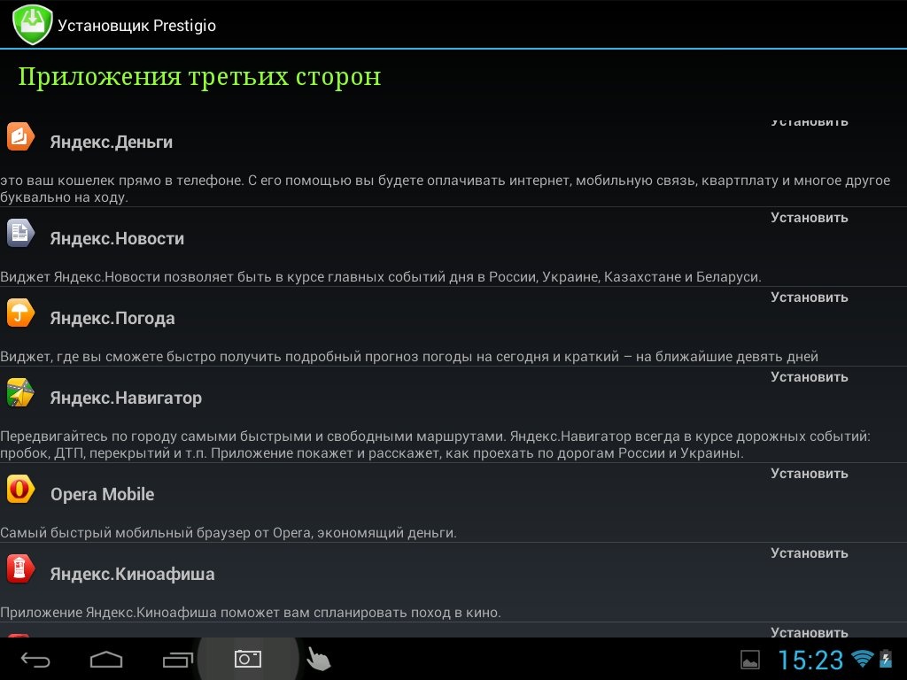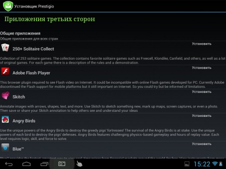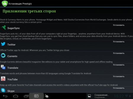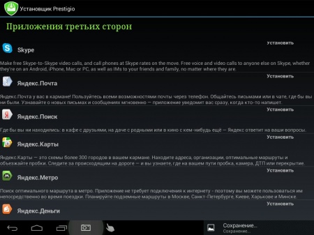 Традиционно хорошим оказался «Установщик Prestigio», в котором, помимо массы других приложений, «затерялись» клиенты Facebook, Twitter, You Tube, а также Skype, большое количество приложений/сервисов Yandex, даже браузер Opera mini плюс приложение Adobe Flash Player. Словом, задействовав весь этот пакет, я тем самым сэкономил себе немалое количество времени на установку всего этого из Google Play.