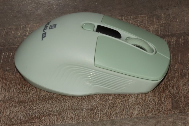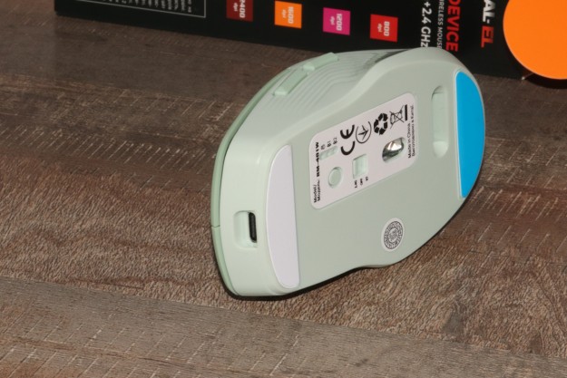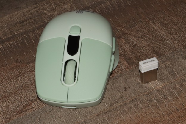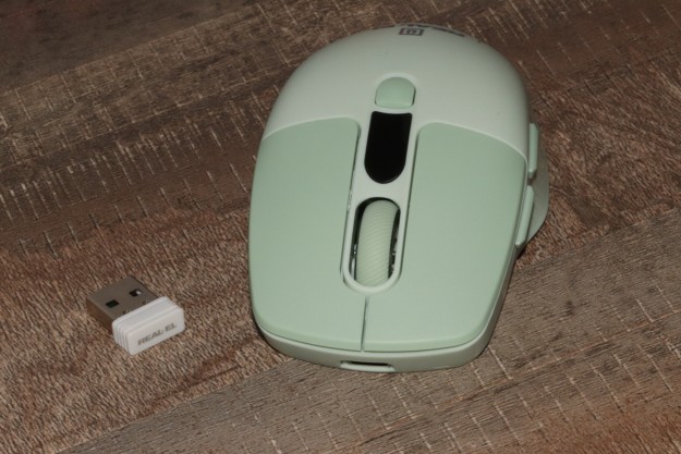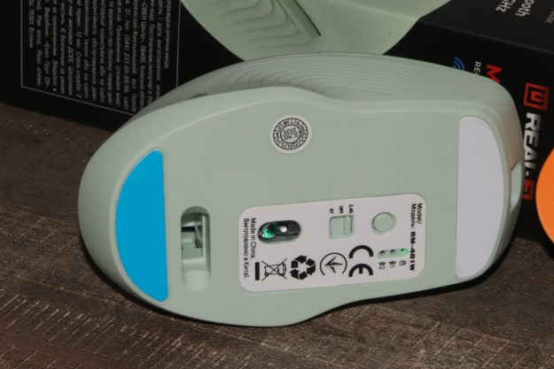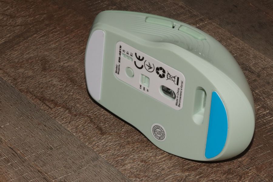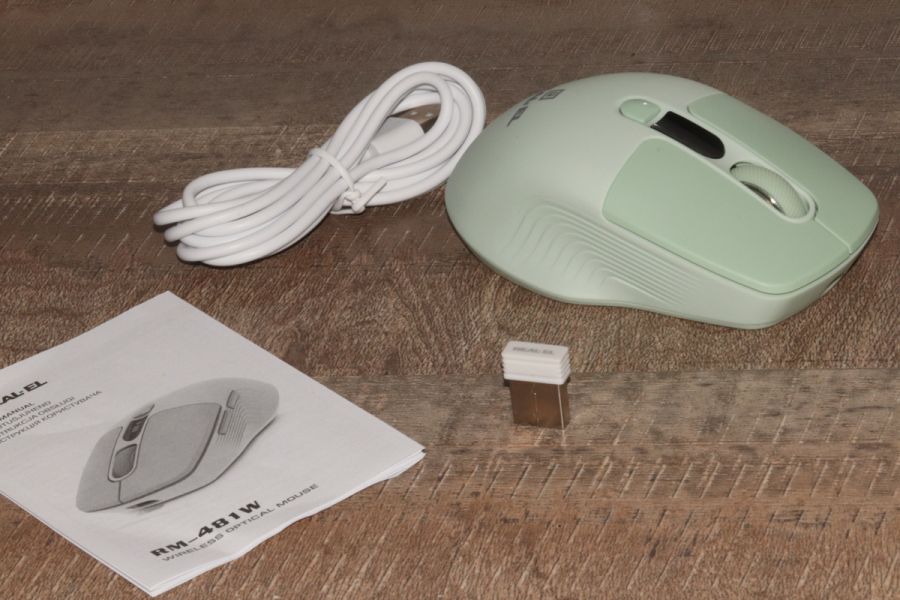 Комплектація Стосовно комплекту поставки, виробник у відповідній коробці передбачив все, що буде потрібно користувачеві разом з маніпулятором: USB-приймач, кабель USB-C для підзарядки вбудованого акумулятора, а також необхідну гарантійну та користувацьку документацію. Дизайн Зовнішність REAL-EL RM-481W – це, безумовно, сильна сторона моделі. Щобільше, як і у випадку з раніше розглянутою REAL-EL RM-370W, RM-481W – можна назвати справжнім витвором мистецтва. Так, можливо це дещо й пафосно, але я не можу відмовити собі в задоволенні назвати цю модель саме так – елегантно, по-своєму витончено та стильно; увага до кожної деталі, навіть найдрібнішої. Окрема любов – колір корпусу. Незвичайне поєднання світло-салатового відтінку з темно-салатовим особисто нас приємно вразило. Словом, в плані дизайну REAL-EL RM-481W є чим привабити. А ще REAL-EL RM-481W – це першокласна симетричність і саме завдяки цьому у нас маніпулятор не лише для правші, але й шульги. Кнопки на ребрі зліва в цьому плані не є аргументом не розглядати останніми дану модель, адже, по-перше – до них досить легко звикнути (висновок нашого колеги-шульги), а по-друге – як мінімум деякий час ви можете обходитися навіть без них. В усьому іншому жодних «але»!; дістав з коробки, увімкнув і через секунду після підключення готовий до роботи. Використані матеріали та якість збірки корпусу Далі поговоримо за те, чому REAL-EL RM-481W вийшла такою акуратною, легкою, а ще ну дуже стильною. «Секрет» цього на поверхні й «сховано» його … ні, не в таємному бункері виробника. Мова саме про пластик, адже він тут напрочуд акуратний, стильний та дійсно якісний. І так, якість тут не лише для галочки – жодної ділянки, які можна було б хоча б мінімально продавити тим же пальцем руки ви тут не помітите. Крім того, матеріал володіє гарною зносостійкістю, про що свідчить чимала кількість часу проведена в тісному сусідстві з іншими речами. А от стиль тут 100% дорівнює поєднанню кольорів – щось приблизно подібне ще треба пошукати. А ще таке ж компактне, зручне, симетричне... Словом, ось така «формула успіху». І для цього тут зроблено дійсний максимум. Ми в редакції любимо причепитися до будь-якої дрібниці. Але це не про RM-481W. Крім пластику, ще «на борту» невелика кількість тефлону та металу. Щодо дисплея на верхній частині корпусу, тут відповідна пластикова підкладка, що цілком логічно. Металевим на зовнішній частині є окантування порту type-C. Ну, а ніжки у нас тефлонові. Останні «з коробки» виробник прикрив захисними плівками синього кольору. І так, транспортувальна плівка на тефлон – «річ» необхідна. Це висновок за підсумками багаторічного тестування мишок саме з такими ніжками. Ергономіка функціональних елементів Крім тефлонових ніжок знизу варті уваги також два перемикачі в центрі. Один з них з позначенням 2.4G/OFF/BT – це власне перемикач між живленням та одним з двох «посередників» підключення мишки. Інша кнопка BT1/BT2/приймач відповідає за перемикання між джерелами підключення. Крім цих елементів, окремої уваги також заслуговує пенал під приймач + наліпка з технічними даними, а ще порт оптичного сенсора. На панелі зверху у нас безшумні кнопки правого/лівого натискання та коліщатко прокручування з гумовим окантуванням. На останньому, до речі, зручні для хвата пальцем насічки; жодних помилок і тому подібних «речей» в підсумку. Хід коліщатка легкий, н