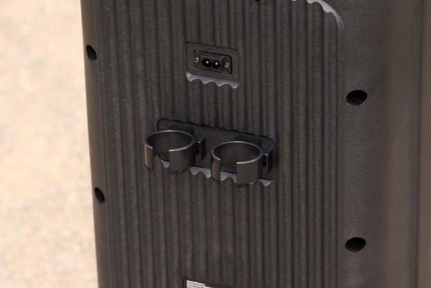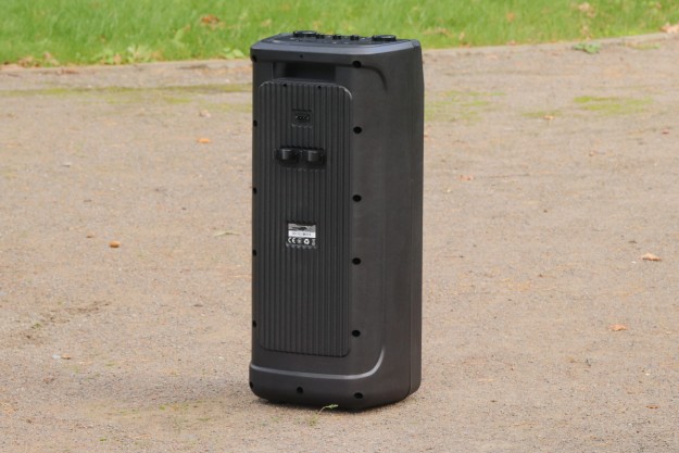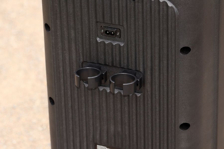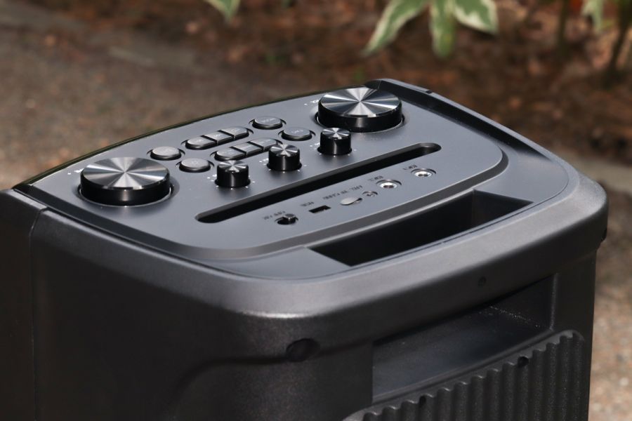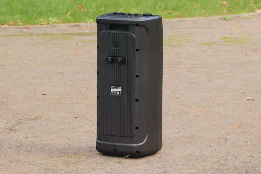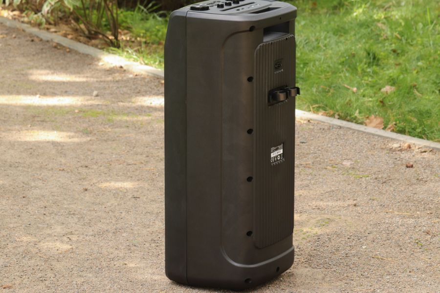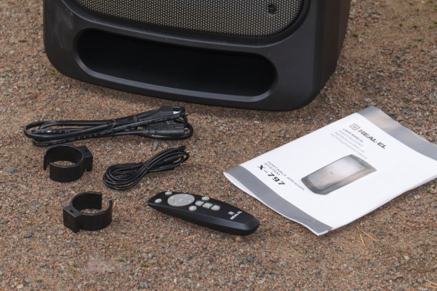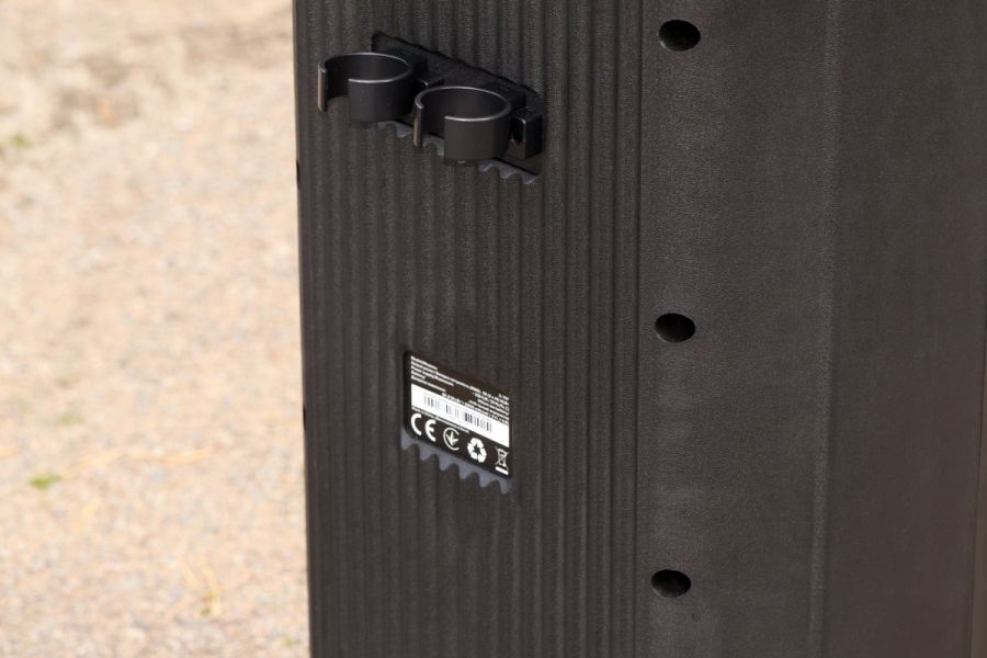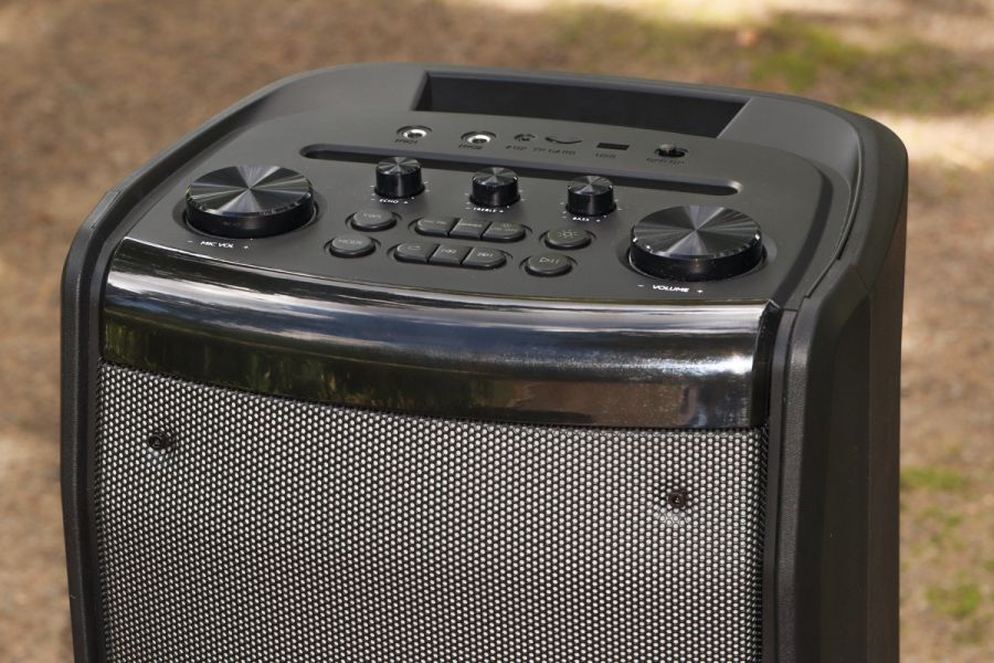 Матеріали корпусу та особливості конструкції По типу тієї ж Х-795, корпус даної системи – це, головним чином, пластик ABS. Практика довела – перед нами матеріал дійсно гарної якості. Окремо варта уваги його стійкість до незначних та середніх впливів джерел довкілля. Так, в спеціальних тестуваннях на стійкість корпусу ми не радимо брати участь, однак щоденна 2-місячна експлуатація, в тому числі «концерти на виїзд» доводять справедливість сказаного. В цьому плані 5 з 5 можливих. Крім пластику, ще маємо гуму – це елементи на нижній частині виробу + метал. Останній-велетенська сітка спереду, кілька елементів окантування портів/інтерфейсів + гвинти, якими виробник зафіксував половинки корпусу в єдину конструкцію. Щодо якості збірки, особисто у нас запитань не виникло – і самі матеріали, і рівень припасування їх між собою варті високої оцінки. REAL-EL X-797 – це портативна акустична система підлогового формату. На це, перш за все, вказують помітні габарити – див. таблицю характеристик вище, а ще вага – 12 кг. Та завдяки вбудованому акумулятору у нас все ж портативне рішення. Так, з деякими досить умовними «компромісами», однак цей «діджей» вміє працювати «з коліс», тобто без потреби в пошуках розетки. До того ж до 7 годин драйву на одному заряді акумулятора – це формат чи не будь-якої вечірки. Круто, чи не так!? Ергономіка – ключові тези Металева сітка спереду прикриває собою масивний «музичний квартет» у вигляді двох 8'' (200 мм) та двох 2.5'' (63 мм). Крім того, тут же поруч у нас діоди наявного «на борту» підсвічування RGB, а в глянсовій смужці в самому верху ефектно вмонтовано RGB-дисплей. Елементи керування всіма процесами в Х-797 на верхній панелі. Крім них, ще маємо цікаво оформлену канавку. Остання спеціально під смартфон або ж планшет користувача. Ви можете додати його сюди, налаштувати відтворення кліпу на відповідний трек, спецефектів еквалайзера і так далі. Словом, всього того, що може додати кольорів вашим враженням протягом вечора. Крім того, ця канавка – це ще й свого роду вдале «розподілення» всієї навігаційної панелі на «сектори підключення зовнішніх джерел звуку та власне навігації з програвання/регулювання гучності. Особисто мої враження - це зручно. Далі щодо зовнішніх джерел звуку. Тут мова за два 6,3 мм роз’єми підключення мікрофонів. Потім йде роз’єм AUX під кабель підключення колонки до джерела звуку, слот microSD та порт USB – для підключення відповідних носіїв відтворення треків. Останнім у цьому «арсеналі» є перемикач живлення. За згаданою вже неодноразово канавкою у нас, перш за все, три досить компактні вали-регулятори тембру НЧ та ін. Окремої уваги заслуговують наявні тут 10 кнопок: TWS, MODE – безпосередньо перемикач між режимами відтворення, MIC PRI - кнопка включення пріоритету мікрофонів, DIMMER – регулювання тембру ВЧ та рівня ехо мікрофона. Ну і, крім того ще у нас два величезні вали-регулятори гучності акустичної системи та відповідно мікрофонів. На тильній стороні системи маємо роз’єм для підключення кабелю живлення/зарядки вбудованого акумулятора. Тут же поряд місця кріплення згаданих на початку кронштейнів; останнє – справа кількох секунд. В підсумку все надійно. Автономна робота У X-797 акумулятор, ємність якого 88,8 Вт*г (8000 мА*г, @11,1 В). Вище ми вже згадували - одного 100% заряду буде достатньо для того, щоб система автономно працювала до 7 год