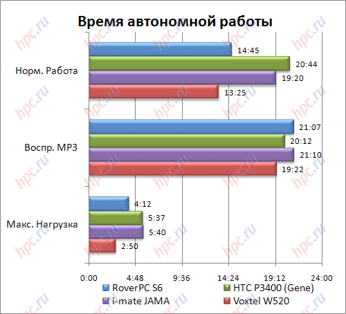 Что касается видеосъемки, то здесь аппарат ничем удивить не может. Максимальным разрешением для роликов является скромное 176 х 144, а в случае записи роликов для MMS запись производится в разрешении 160 х 120. По качеству ролики слегка уступают тому же ASUS P525. Зато здесь предусмотрена возможность записи в разных форматах: 3GP, 3G2 или MP4. Время автономной работыПрежде чем, приступить к замеру времени автономной работы, напомним, что емкость комплектного аккумулятора составляет 1100 мАч. К тому же, в комплекте с коммуникатором поставляется запасной аккумулятор аналогичной емкости. Так что в принципе полученные результаты можно удвоить. Со времени публикации последнего обзора в методике тестирования ничего не изменилось. Итак… 1. Режим максимальной нагрузки. Яркость подсветки выкручена на максимум, громкость динамика тоже, включены Wi-Fi и Bluetooth модули, через Windows Media Player в цикле воспроизводится "тяжелый" видеоролик. Время автономной работы в этом режиме составило – 4 часа 12 минут. 2. Чтение текста. Все беспроводные модули отключены. Яркость подсветки установлена на второе по счету деление. На коммуникаторе запущено чтение текста в программе Haali Reader с автоматической прокруткой. Время работы составило – 14 часов 45 минут. 3. Воспроизведение МР3. Wi-Fi, Bluetooth и экран выключены. Прослушивание через наушники на максимальной громкости. Использовался Pocket Media Player и композиция с постоянным битрейтом (192 kbps). Время работы – 21 час 7 минут.