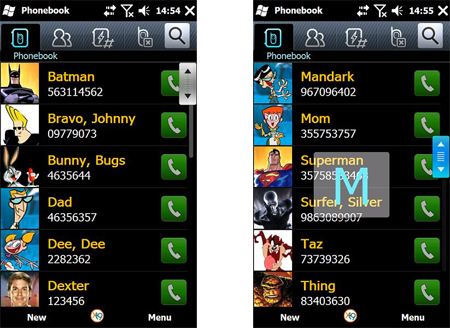Контакты из телефонной книги и SIM-карты отображаются вместе или по отдельности. Перемещать, копировать или удалять контакты можно поодиночке или списком. Поиск по телефонной книге можно вести несколькими способами - перемещаться с помощью удобного ползунка, пользоваться кинетическим скроллингом или побуквенным набором имени. ![]()
