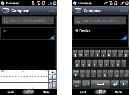 Наконец, остается вопрос, как же писать сами сообщения. Во-первых, есть очень удобная QWERTY-клавиатура для пальцевого набора, которая работает в портретном и ландшафтном режиме с виброоткликом. Во-вторых, есть стандартная Windows Mobile клавиатура, правда, работать с ней можно только с помощью стилуса. ![]()