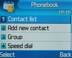 Телефонная книга поддерживает три поля для номера (домашний, мобильный, рабочий, а также факс, группы, адрес, E-mail, заметка, иное) и поля для персонализации (фото и мелодия). Поле для даты рождения отсутствует. Группе также можно присвоить фото и мелодию. На клавишу можно назначить номер для быстрого набора. Поддерживается возможность визитки, то есть в телефоне будет храниться желаемая информация о вас. Ее при необходимости можно переслать по электронной почте, Bluetooth, SMS, MMS.