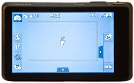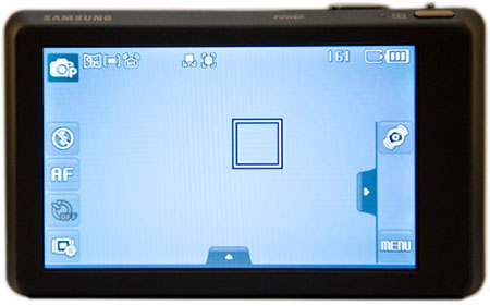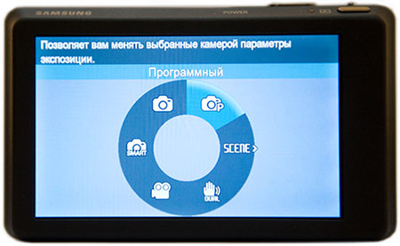 легко выронить, остается. У Samsung ST550 вместо обычных органов управления использован сенсорный дисплей. Насколько такое решение добавило удобства в использовании? Не знаю. Но одно точно - это позволило увеличить экран до максимальных размеров. Он крупный, с возможностью регулировки яркости и отличным разрешением 1,15 млн. пикселей (800х480). Если бы органы управления не были сенсорными, то пришлось бы отдавать место на корпусе под переключатели режимов, джойстики, кнопки управления - а так: есть и большой дисплей и все пункты меню легко достигаются лёгким нажатием на экран. ![]()