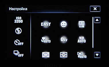располагаться на главном экране. Это удобно! Аккумулятор Sony Cyber-shot TX5, честно говоря, не впечатлил ёмкостью. Хватает его где-то на 180-200 снимков. На активный день эксплуатации со съемкой видео и фото его точно не хватит. Поэтому если будете покупать камеру, то имеет смысл сразу приобретать ещё один аккумулятор и носить его с собой про запас. В главное меню Sony Cyber-shot TX5 можно попасть, нажав, соответственно кнопку Menu. После этого пользователь оказывается в окне кнопок, где может настроить основные параметры съемки: ISO, размер изображения, выбрать режим фокусировки или баланс белого. Отсюда же можно уйти в окно, где вы можете выбрать, какие кнопки будут показываться на первом экране фотоаппарата. ![]() ![]() ![]() ![]() ![]() ![]() ![]()