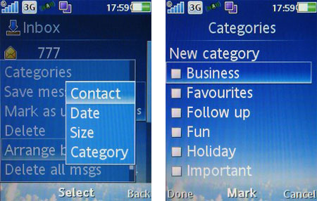 же предлагает внести в календарь, что очень удобно. ![]() Классически работает поиск по имени абонента, но без интересных новшеств не обошлось - поиск телефонного номера по цифрам, которые в него входят. Список звонков разделен на четыре подраздела: все вызовы, отвеченные, набранные и пропущенные. Качество связи не показывает ни прогресса, ни ухудшения. Звук динамиков чистый и громкий, но не более. Для любителей писать SMS или электронные письма производитель установил последнюю версию менеджера сообщений, предлагающую большое число настроек. Привычно для телефонов этого производителя: при написании SMS-сообщения появляется предупреждение, если вы превысили лимит в 160 знаков латиницей. Уже прочитанные и особо ценные для вас сообщения могут быть сохранены на карте памяти или в памяти телефона, а также рассортированы по дате, размеру, адресату или категории. Как считают создатели, все сообщения можно поделить на шесть разновидностей - бизнес, избранные, важные, планы, развлечения, отдых. Если вы с ними не согласны, можете создать те категории, которые больше подойдут вам - благо, телефон дает простор для такого творчества. ![]() Почтовый