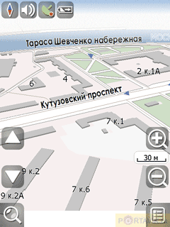 Скорость загрузки навигационной программы Навител у обоих коммуникаторов оказалась примерно одинаковой — 5-6 секунд. А так (справа — HTC Touch Pro) на экранах коммуникаторов выглядит один и тот же участок навигационной карты в одинаковом масштабе: ![]()