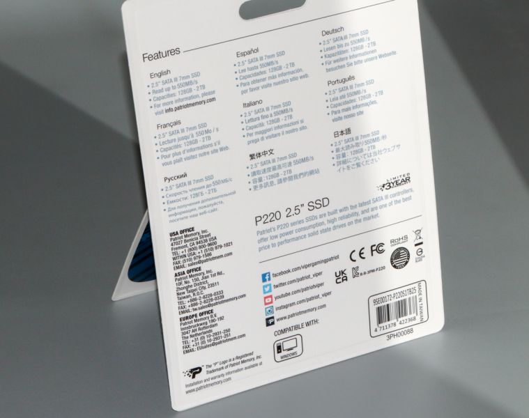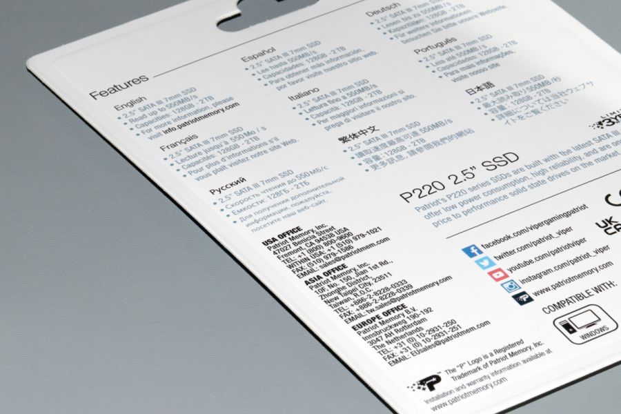 Огляд SSD Patriot P220 (1ТБ) – нові швидкості для твого ПКТвердотільний накопичувач Patriot P220 стане гарним рішенням для тих користувачів, які прагнуть «прокачати» можливості свого ПК/ноутбука саме в цьому напрямку. Чому? Дізнаєтесь, дочитавши цей огляд до кінця. Упаковка та комплект поставки Коробка під Patriot P220 (1ТБ) виготовлена в тому ж стилі, що й упаковка під раніше розглянутий Patriot P400 Lite 1TБ. В підсумку маємо компактне рішення одноразового використання з помітним блістерним вікном на передній панелі. Останнє – це водночас і пенал для розміщення виробу всередині, і вікно, через яке можна досить детально ознайомитися з дизайном виробу без необхідності виймати його з коробки. На стінках чимало корисних даних щодо особливостей самої моделі. Всі деталі на цей рахунок далі на ілюстраціях. Стосовно комплекту поставки, традиційно в Patriot це сам виріб. В нашому випадку маємо SSD P220 (1ТБ). Технічна документація зайва; гарантійна – чек, що засвідчує офіційність покупки. Гарантія, до речі, 3 роки. Ключові технічні характеристики