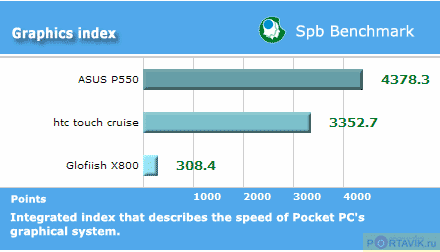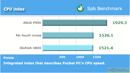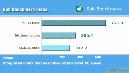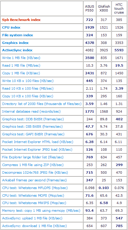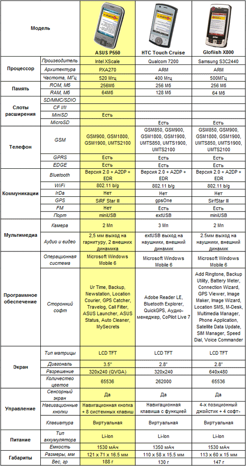 Основным конкурентом ASUS P550 можно назвать только RoverPC N6, однако на момент тестирования его в нашей редакции не оказалось, поэтому мы решили для сравнения взять HTC Touch Cruise и Glofiish X800. Оба аппарата имеют близкую с 550 ценовую категорию и схожие характеристики.
