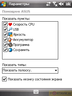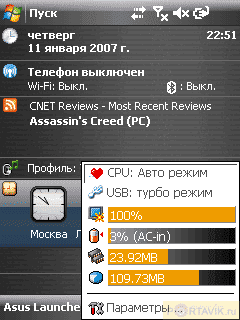 Работает ASUS P550 на основе операционной системы Windows Mobile 6.0 на базе мощного процессора Intel XScale PXA270 с тактовой частотой в 520Мгц. Как мы уже сказали в обзоре, на сегодняшний день это один из самых производительных чипов, который устанавливают в коммуникаторы.