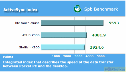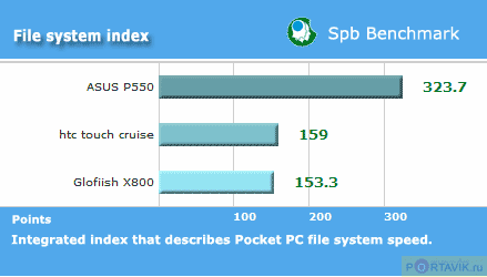 Ресурсов процессора хватает на работу со всеми приложениями, в том числе и с «тяжелыми», например, с навигационной программой. Во время тестирования ASUS P550 показал отличные результаты — он легко справлялся как со всеми основными приложениями, так и с тяжелыми навигационными программами. Кроме того, результаты проигрывания неконвертированного видео очень высоки. Подробно о них мы расскажем ниже. Если же сравнивать его с основным конкурентом в лице RoverPC N6, то ASUS оставляет его далеко позади. Да и другие современные коммуникаторы высшей ценовой категории не смогут тягаться с новинкой в производительности. Разве что наш недавний гость Gygabyte Gsmart MW998 может сравниться с P550.