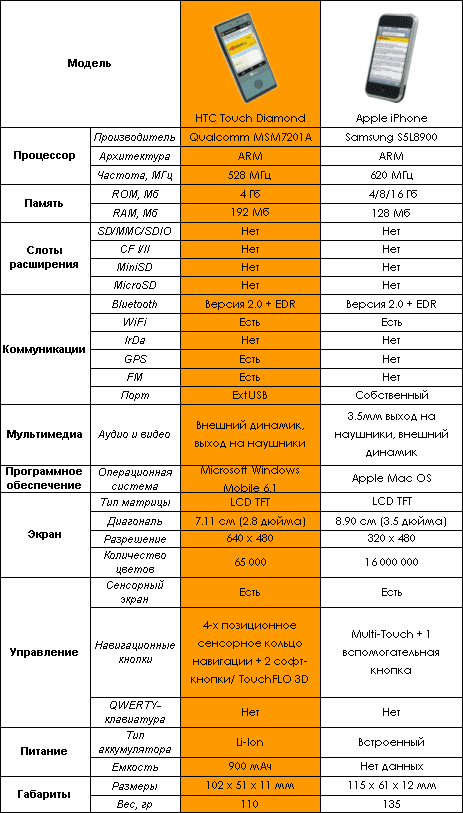 Мойте руки перед... тестом. Основательно размяв пальцы, мы взяли в соперники к HTC Touch Diamond коммуникатор Apple iPhone, без поддержки сетей 3G. В нашем случае это будет версия с 8 Гб внутренней памяти. Нет смысла говорить о мотивах нашего выбора — все это вы можете прочитать в первом знакомстве или обзоре. Скажем лишь: назвался устройством с «ручным» управлением — изволь быть сравненным с «ай-фоном».