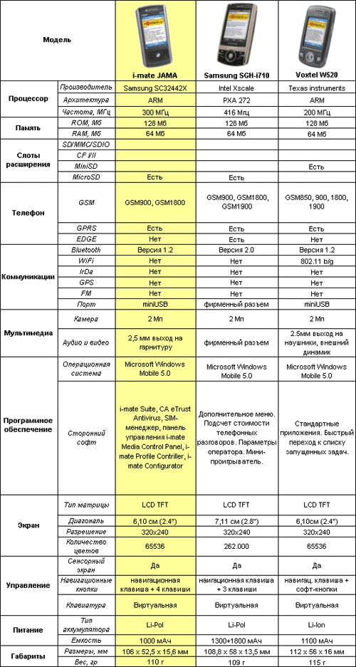 Ниже приводятся таблица сравнения технических характеристик коммуникаторов i-mate JAMA, Samsung SGH-i710 и Voxtel W520.