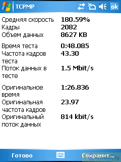 Для тестирования на предмет возможности i-mate JAMA проигрывать видео нами использовался плеер TCPMP. Тест проходили два ролика: один отконвертированный, с разрешением 320x240, а второй — оригинальный, с разрешением 672x288 точек. Отличным результатом, как известно, считаются 120%.