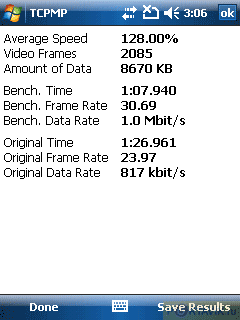 Переходим к одному из самых интересных разделов, в котором мы проверим наш O2 XDA Atom Life на предмет способности к воспроизведению видео. Как обычно, мы берем TCPMP-плеер и проигрываем два видеоролика: один «тяжелый», с разрешением 672 x 288 пикселей, а второй — конвертированный, разрешение которого составляет 320 x 240 пикселей. Отличный результат, напомним, составляет 120%.