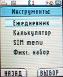 Пункт "Инструменты" содержит "Ежедневник" (вполне сносный), калькулятор, SIM-меню и фиксированный набор. Кстати, будильник в аппарате есть, причем он выведен в главное меню. Его можно выставить на ежедневное и разовое срабатывание, кроме того, он работает и при выключенном телефоне - это плюс, менять мелодию будильника нельзя - это минус.