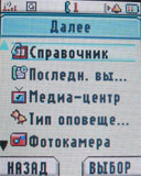 Пункт "Далее" содержит то, что не попало в в основной список. Здесь находятся: телефонная книга, список последних вызовов (длительность не фиксируется, лишь дата и время, запоминаются 20 набранных и 10 входящих/пропущенных вызовов), медиа-центр (папки с контентом - фотографиями, рингтонами, диктофонными записями и др.), фотокамера, диктофон и другие функции.