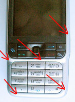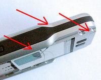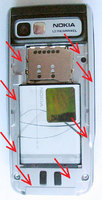 Внешность телефона сделана с акцентом на практичность. Здесь нет вычурных решений или стиля а-ля "закругленный ромб", как в Nokia 7610/6670. Дизайн аппарата строгий, даже можно сказать, аскетичный. Сменных панелей не предусмотрено, зато корпус не хрустит в руках. Нет глянцевых вставок, зато на панелях не видны отпечатки пальцев. Главное, что стоит отметить во внешности смартфона - мощный металлический каркас. Внешне он выглядит как металлическое окаймление периметра корпуса. На самом деле это не тонкая полоска алюминия, как это обычно делается из оформительских соображений, а лишь вершина айсберга, представляющего собой металлическую раму, на которой и крепятся все детали аппарата. Достаточно снять заднюю крышку, чтобы в этом убедиться - почти все заднее пространство занято металлическим каркасом. Сделан он из очень легкого сплава, вряд ли титана, так как мы легко царапали острым предметом, скорее что-то типа дюрали. Основное назначение металлического основания, очевидно, - придание всей конструкции прочности для защиты при падениях и ударах. Краш-тест мы, конечно, не устраивали, но впечатление об основательности и надежности корпуса у нас тем не менее осталось. Впрочем, мы не исключаем возможности проведения краш-теста Nokia 3230, только теперь это будет не просто любительский эксперимент наподобие того, как мы разбивали Siemens M65 и Nokia 5140. В тесте будет присутствовать и научная составляющая - телефон будет бросаться на гранитную поверхность с разных высот и под разными углами. Для эксперимента была смонтирована специальная установка в лаборатории Института Механики при МГУ. В скором времени "Мобильный Форум" начнет тестирование телефонов по критерию механической прочности - следите за новостями. А теперь мы вернемся к Nokia 3230. Ниже на фото мы показали стрелками металлические части телефона. На первый взгляд и не скажешь, что смартфон буквально закован в металл, но, как видим, так оно и есть. Надо сказать, что такой ход производителя очень оправдан для продукта, который будет продаваться большими тиражами.