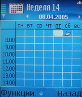 С Интернетом у нас не возникло никаких проблем. Все стандартно и просто. Как и в предыдущих смартфонах, в Nokia 3230 можно с успехом смотреть как WAP, так и обычные HTML-страницы. Телефон поддерживает как GPRS, так и EDGE. Календарь, он же органайзер. Есть ежемесячный и еженедельный вид, а также обзор дня. Началом недели можно выбирать любой день. Предусмотрено три типа событий: встреча, памятка, годовщина.