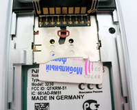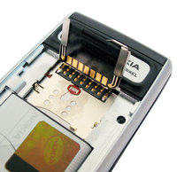 Раз уж мы заговорили о карте памяти, упомянем и о SIM-карте, которая крепится непосредственно под "флешкой". Таким образом, придется сначала открыть крепления карты памяти, затем снять аккумулятор и только потом можно будет вынимать "симку". Для более удобного ее изъятия предусмотрен ползунок. Обидно, что Nokia 3230, как и все предыдущие финские смартфоны, наотрез отказывается работать, если SIM-карты нет на месте. Таким образом, ни одной функцией могучего смартфона не воспользоваться, пока не вставить "симку".